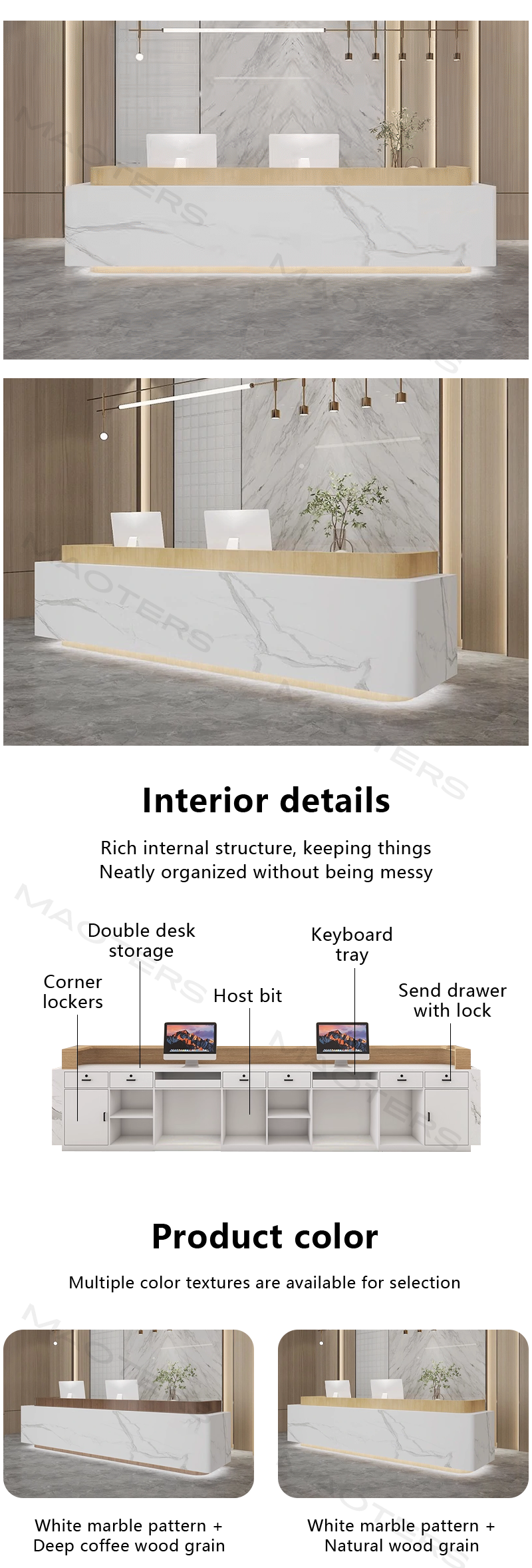 I just moved this reception desk to the office,and it looks fantastic.The color scheme creates a high-end feel and matches our studio's atmosphere perfectly.The workmanship is very solid,even better than I expected,and the shipping was very fast.I'm very satisfied.