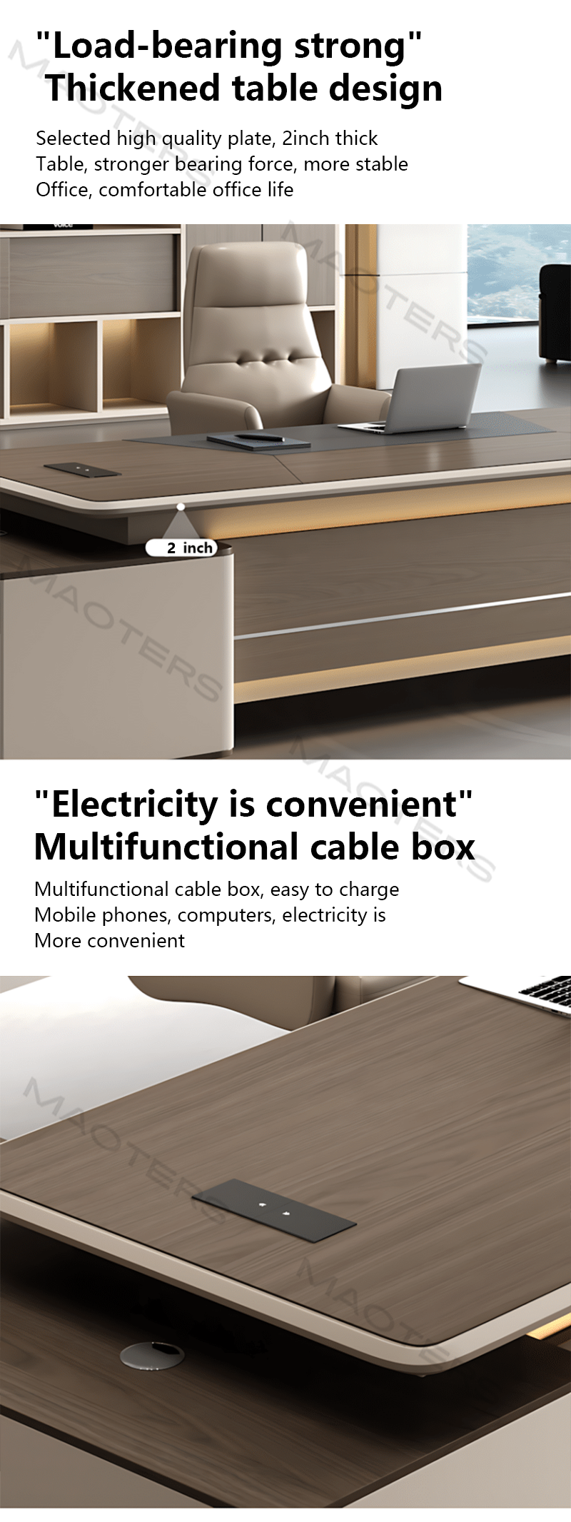 Why Choose the BOSS Desk?✔ Executive Presence – A bold, contemporary design with clean lines and premium finishes (wood veneer, matte metal, or high-gloss lacquer) that radiates leadership. ✔ Expansive Work Surface – Ample room for dual monitors, documents, and executive accessories, with an optimized ergonomic height for all-day comfort. ✔ Smart, Secure Storage – Features soft-close drawers, lockable file cabinets, and hidden compartments to keep sensitive materials organized and confidential. ✔ Built for Endurance – A reinforced steel frame and scratch-resistant desktop withstand the rigors of high-stakes decision-making. ✔ Seamless Cable Management – Discreet routing channels and grommets maintain a sleek, wireless look even with full tech setups.