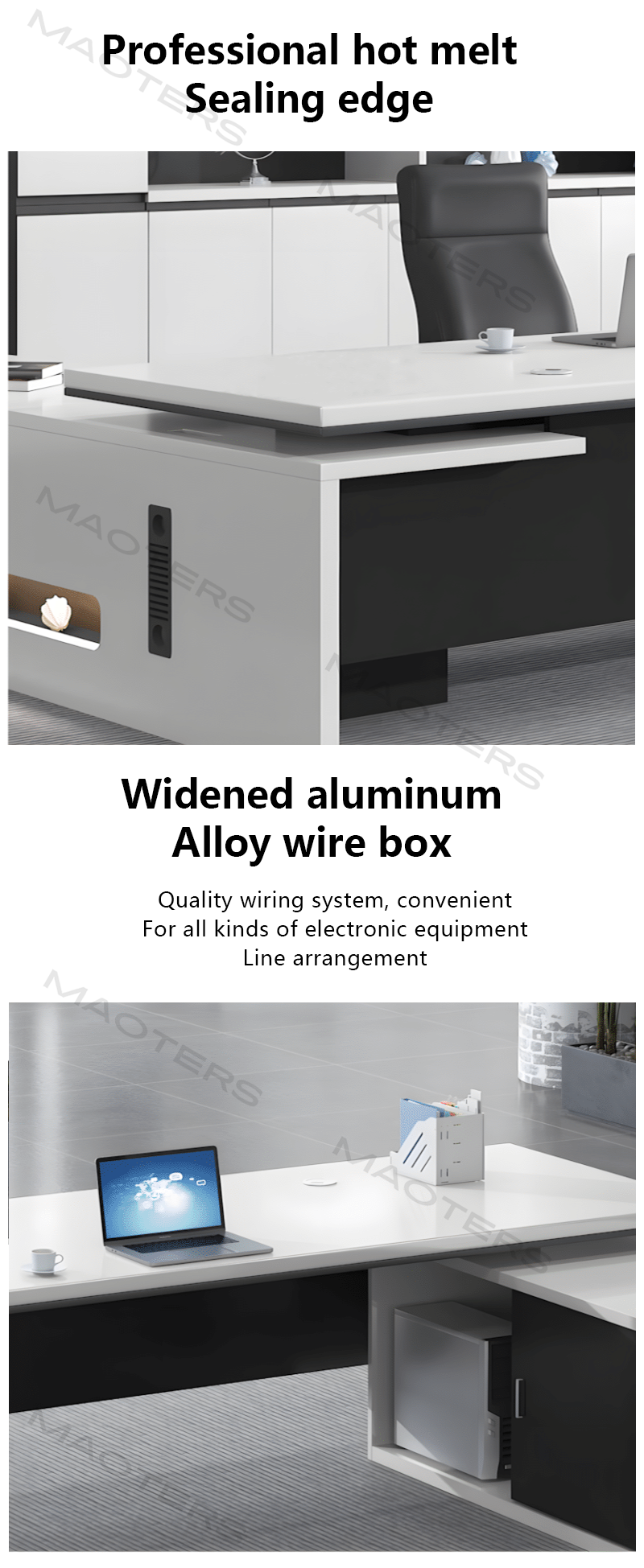 Built for Leadership✔ Commanding Presence – A bold, authoritative design with premium finishes that establishes your leadership position ✔ Expansive Work Surface – Generous L-shaped or rectangular layout provides ample space for multiple monitors, paperwork, and team meetings ✔ Secure Storage System – Locking file drawers and confidential document storage keep sensitive materials protected ✔ Team Management Ready – Built-in charging stations and accessory docks keep your devices powered and organized ✔ Durable Construction – Commercial-grade steel-reinforced frame withstands daily supervisory demands