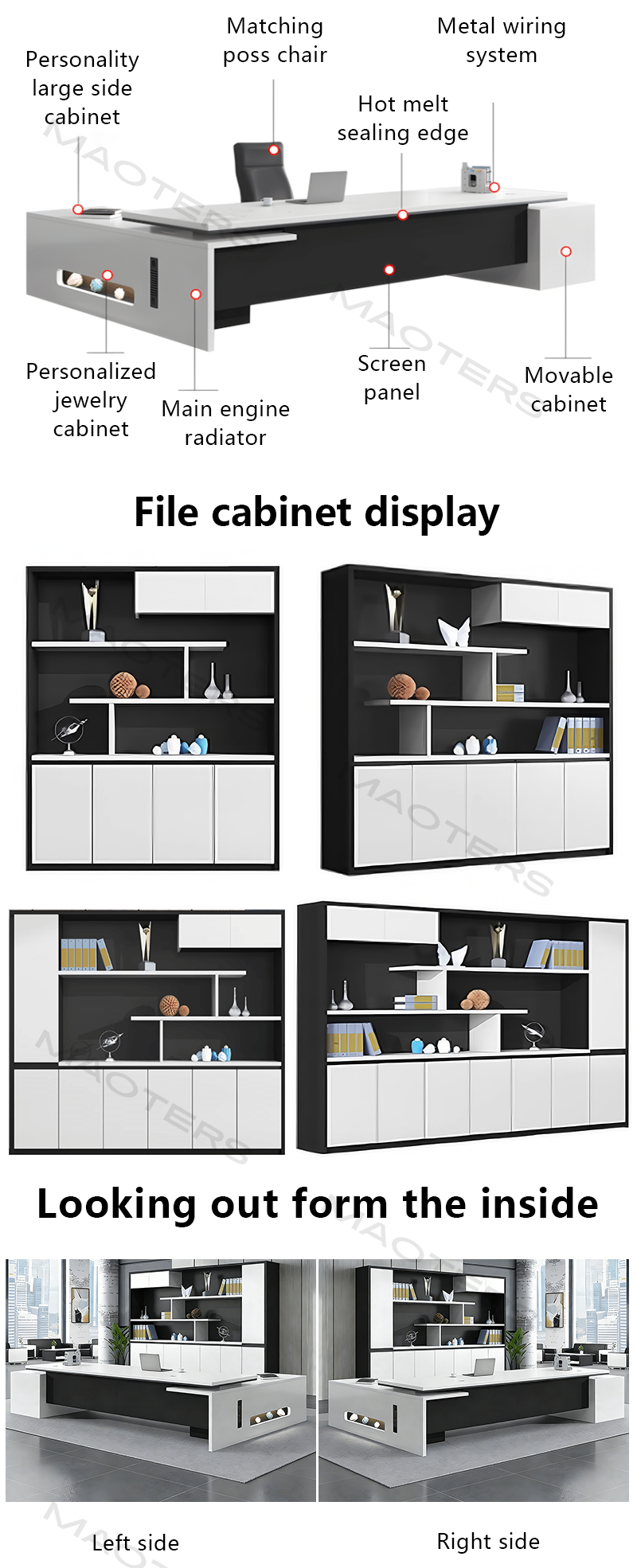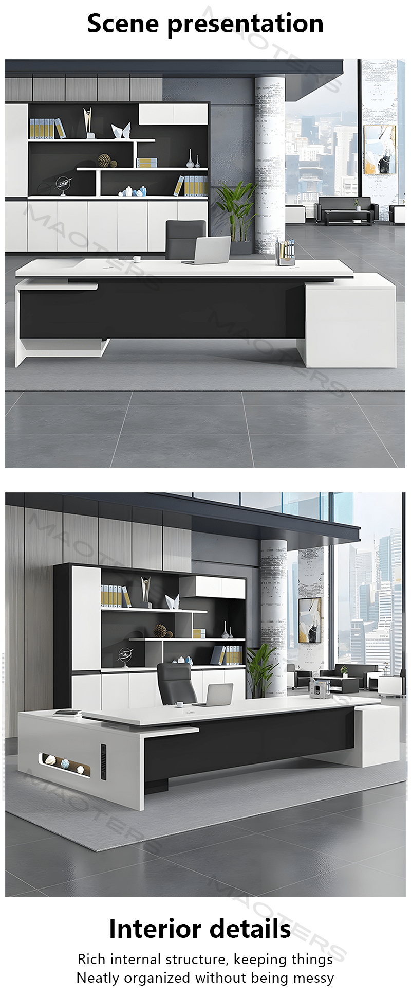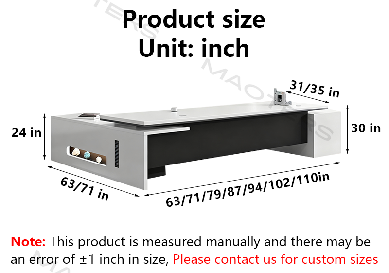The boss's desk is custom made. The boss likes the style very much. It is in line with the modern office environment. The color coordination is very good and not easy to get dirty. The side cabinet space is also large enough. The table top is very thick.