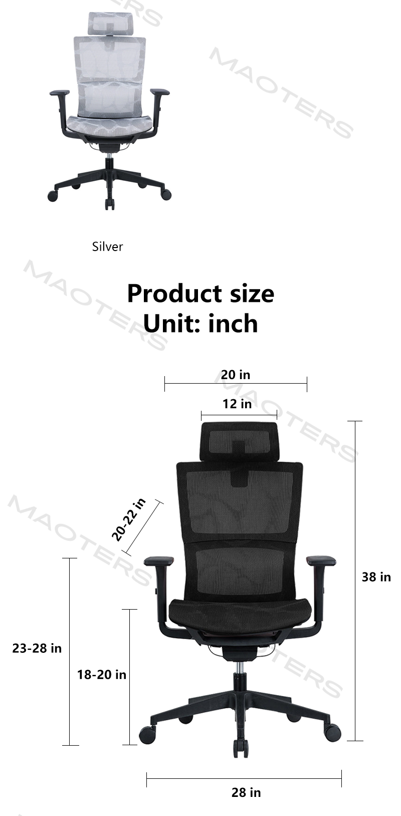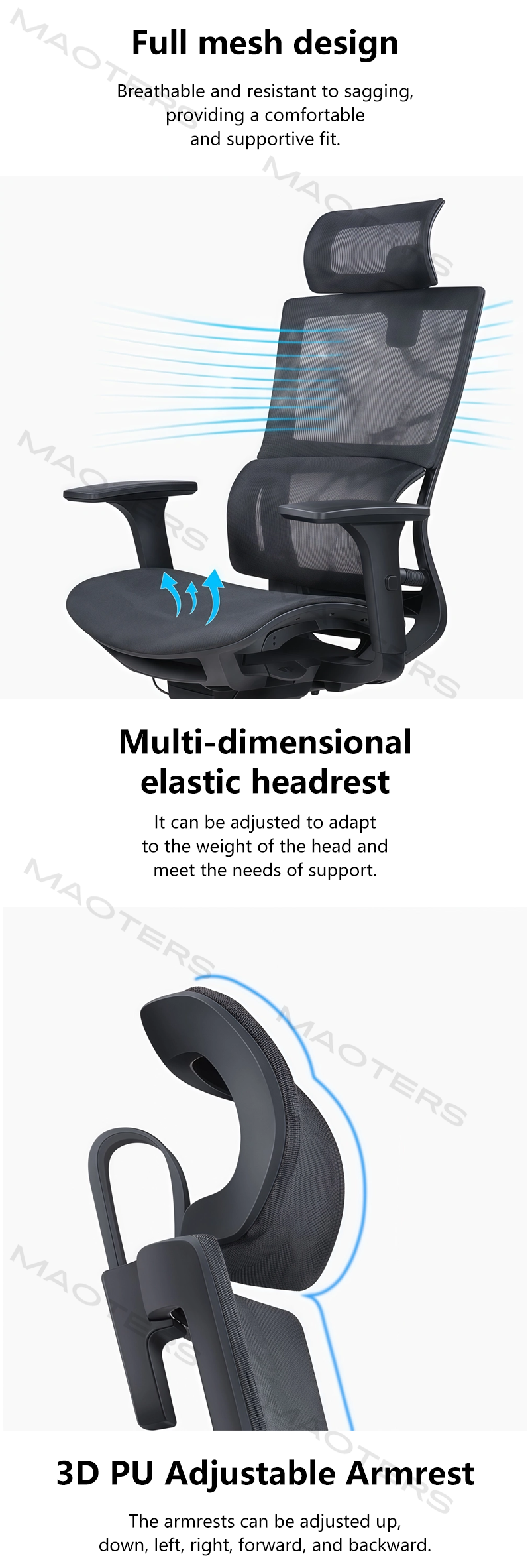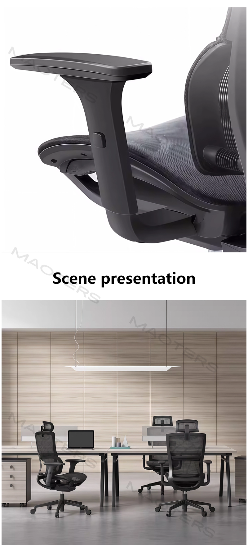 • 3D adjustable armrests support height, angle, and fore-aft adjustments, perfectly matching your working posture.