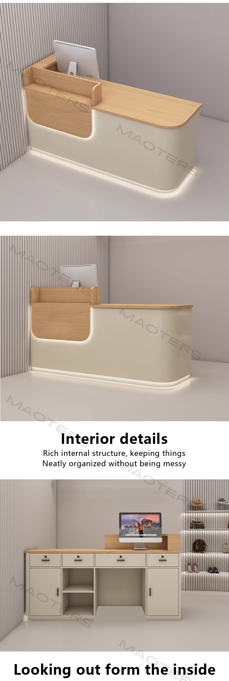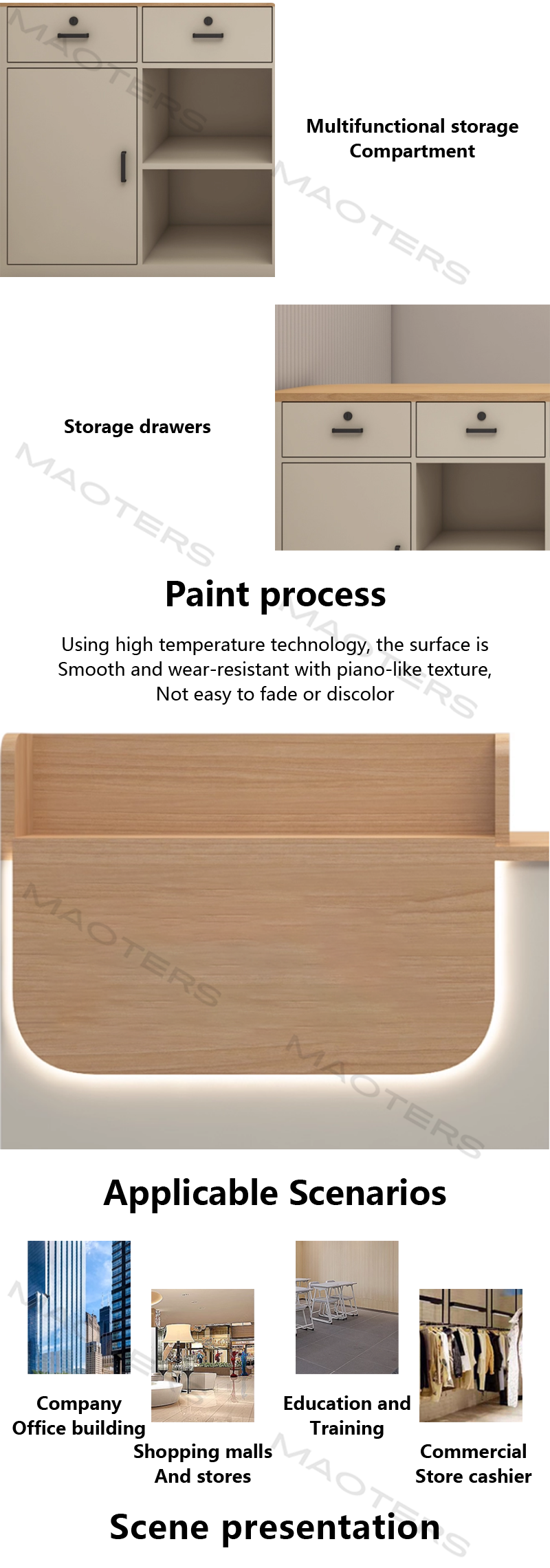 This clothing store cashier reception integrated station is designed for small business owners, perfectly combining checkout function and reception service, and is the core hub of your store operation. We know that small clothing stores need to maximize the use of every inch of space while maintaining brand tone, so we launched this multi-functional workbench that integrates cashier, packaging, storage and brand display.