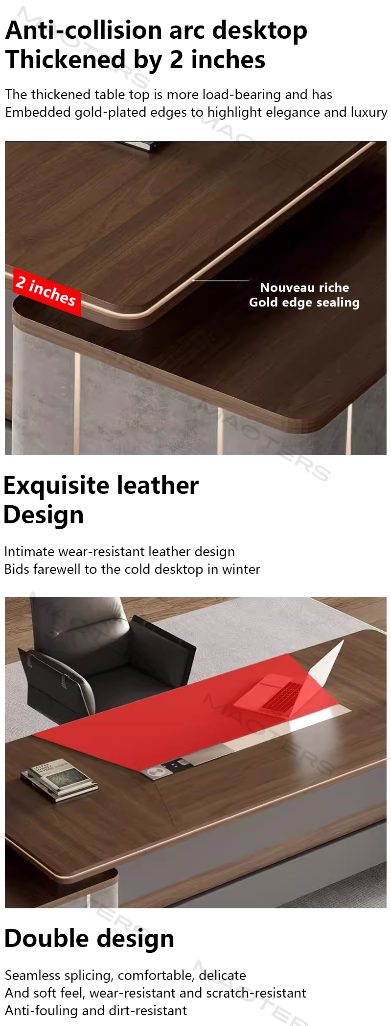 Premium Features: ✔ Luxury Build Quality – Handcrafted from top-grain materials including solid wood, tempered glass, and brushed metal accents ✔ Innovative Design Elements – Features integrated power outlets, hidden cable management, and optional built-in wireless charging ✔ Executive Work Surface – Spacious 60″+ desktop accommodates multiple monitors while maintaining a clean, uncluttered appearance ✔ Designer Details – Signature finishes include matte black with gold trim, walnut veneer, or premium white gloss options ✔ Smart Storage Solutions – Floating drawer design with soft-close mechanisms and biometric security options