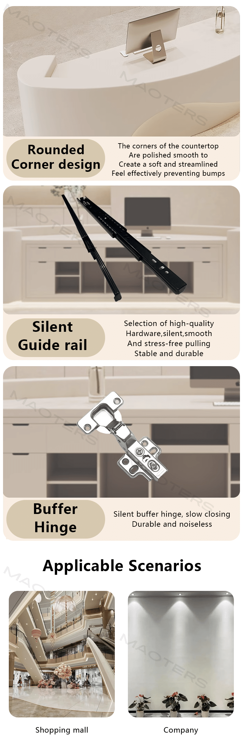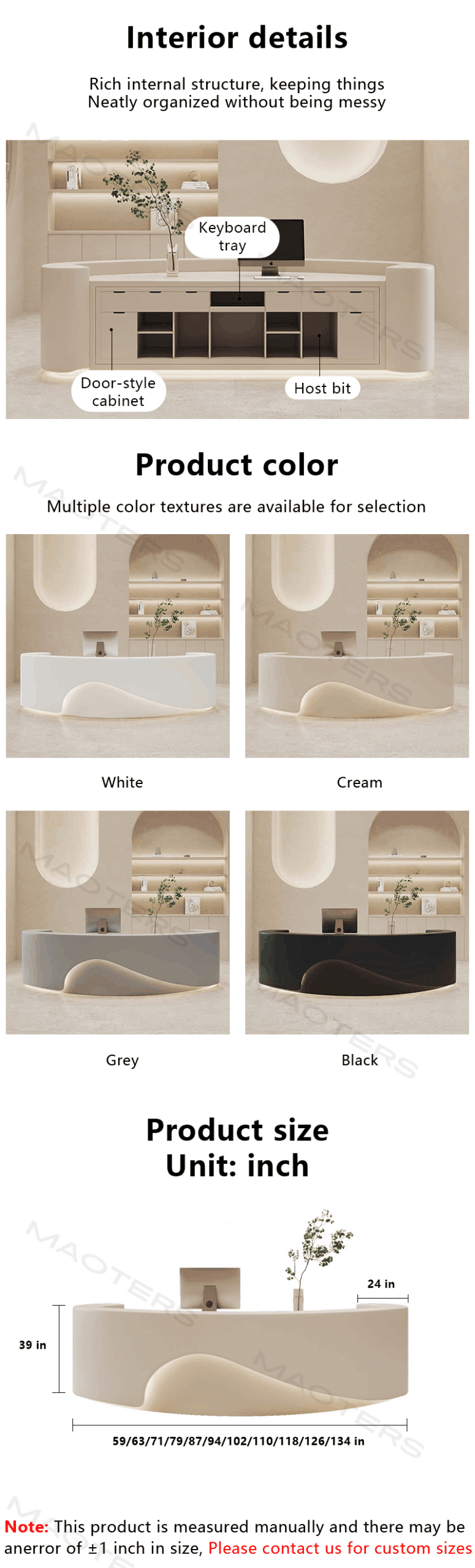 "I absolutely love the rounded edge design of this reception desk!The edges are finely polished,creating a smooth and soft feel that's both stylish and practical.It's incredibly user-friendly and makes me feel safe,especially with no sharp corners.The desk looks modern and sleek,with a polished finish that adds a professional touch to my office.I'm really impressed with the attention to detail in the design!"holds all of my office documents and equipment.The high-density board material feels durable and looks high-end.I especially love the LED ambient lighting feature,which gives a warm and welcoming atmosphere,perfect for greeting clients.The overall design meets all my office needs.Highly recommend it to anyone looking for quality office furniture!