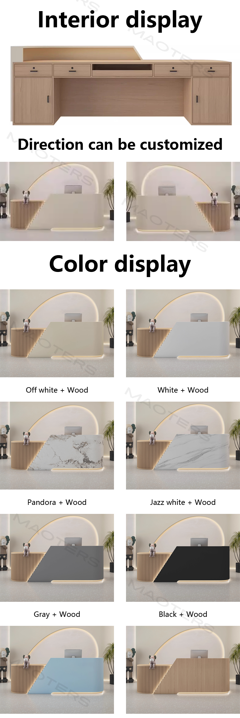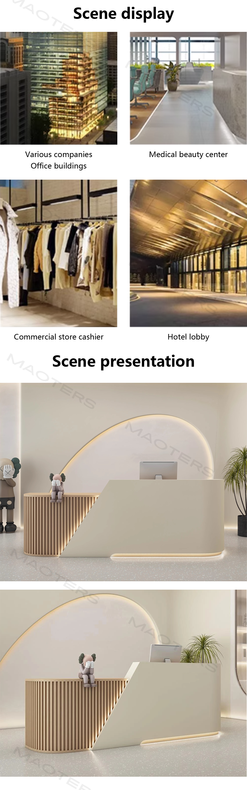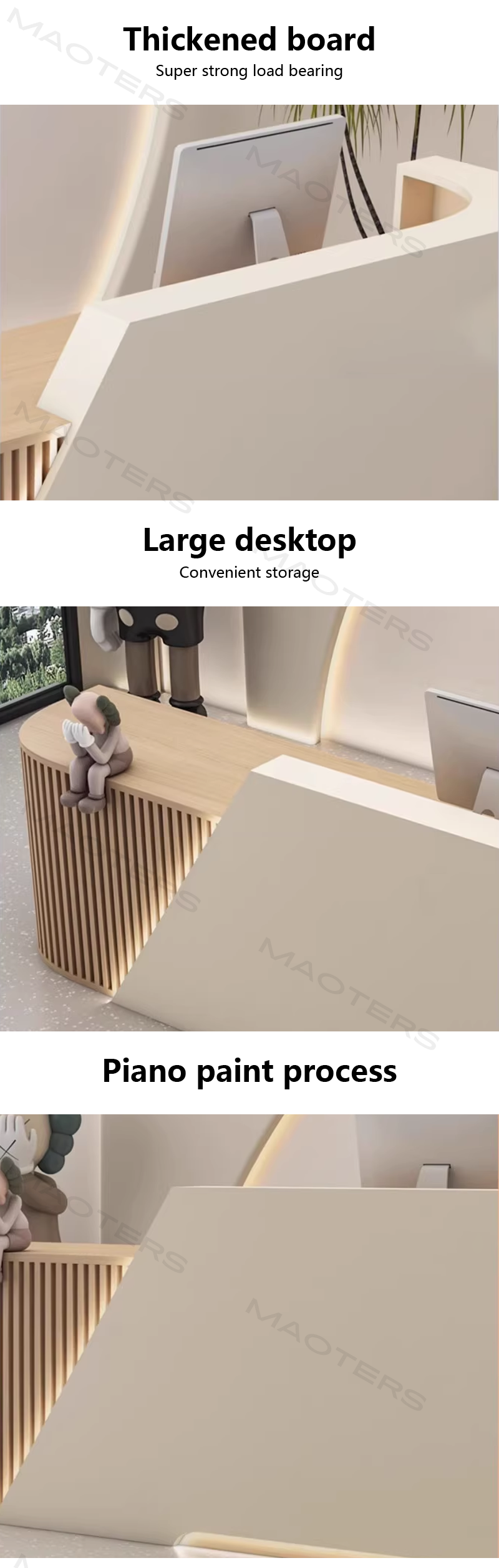 This isn’t just a reception desk; it’s the perfect introduction to your salon or training center’s brand image and professional services. Our meticulously designed reception desk, with its smooth curves and modern aesthetic, greets every guest, creating a warm and professional first experience. Between sharp corners and angles, its soft curves are not only safe and comfortable, but also create a warm and welcoming atmosphere. Its streamlined appearance, like a sculpture, becomes a visual focal point in your space, instantly elevating the atmosphere. Professional Division and Efficient Functionality: Customer Service Area: A spacious, clean countertop facilitates appointments, consultations, and checkout. Staff Workspace: Ample storage beneath the countertop keeps documents, products, and office supplies neat and organized. Concealed Cable Management: Built-in cable management slots easily organize cables for computers, phones, POS terminals, and other devices, ensuring a safe and aesthetically pleasing workspace. Superior Durability and Easy Cleaning: The high-quality, scratch-resistant finish withstands the wear and tear of daily use, water damage, and chemicals, ensuring long-lasting durability. The smooth surface can be easily wiped to look like new, which perfectly meets the hygiene standards of the salon environment.
