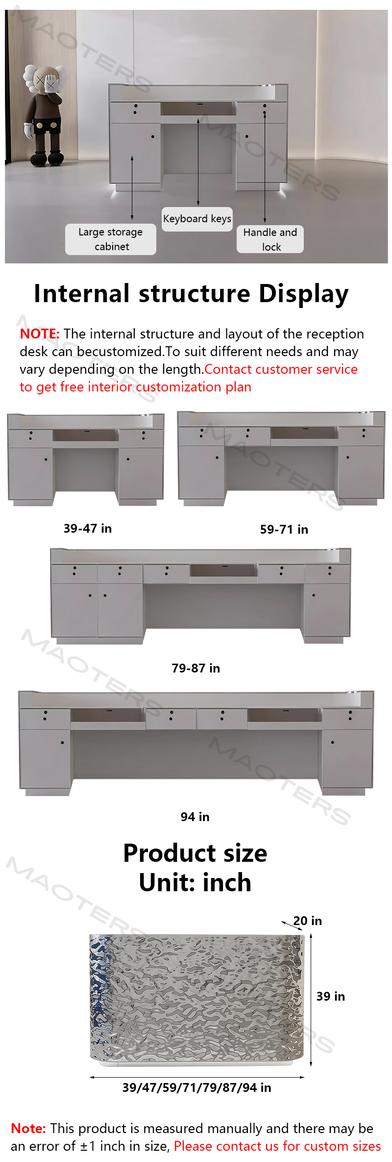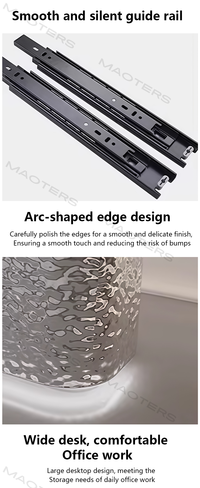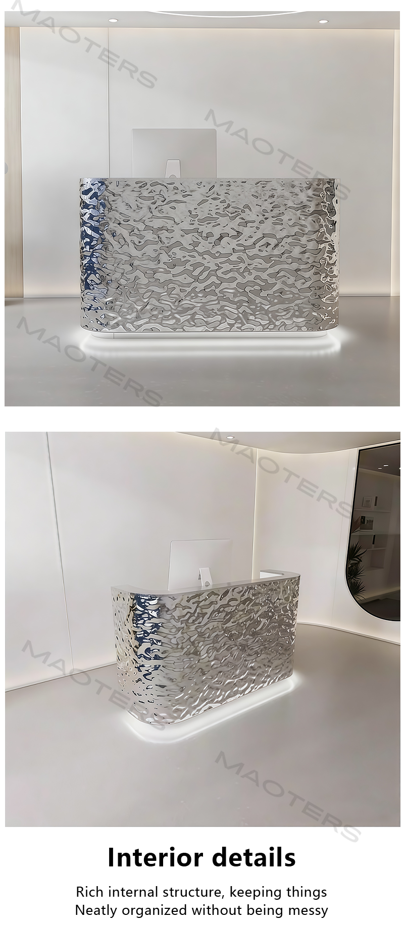 The water – ripple design, combined with the mirror – like stainless – steel material, shimmers with light and shadow under the illumination of lights, creating a dynamic and elegant atmosphere for the space. The water – ripple texture is formed by a special process, and the light and shadow changes under different angles greatly enrich the sense of hierarchy.The water – ripple texture increases the friction on the surface of the bar counter, providing extra grip and reducing the risk of items sliding compared to a smooth surface.The flowing “water – wave” shape symbolizes vitality, innovation, and infinite possibilities, making the bar counter not only a functional center but also a highlight of the space, reflecting a modern and luxurious style. The mirror – like surface is smooth and not easy to attract dust and stains. It can be kept clean and tidy by simply wiping it with a damp cloth, and the maintenance is very convenient in daily life.