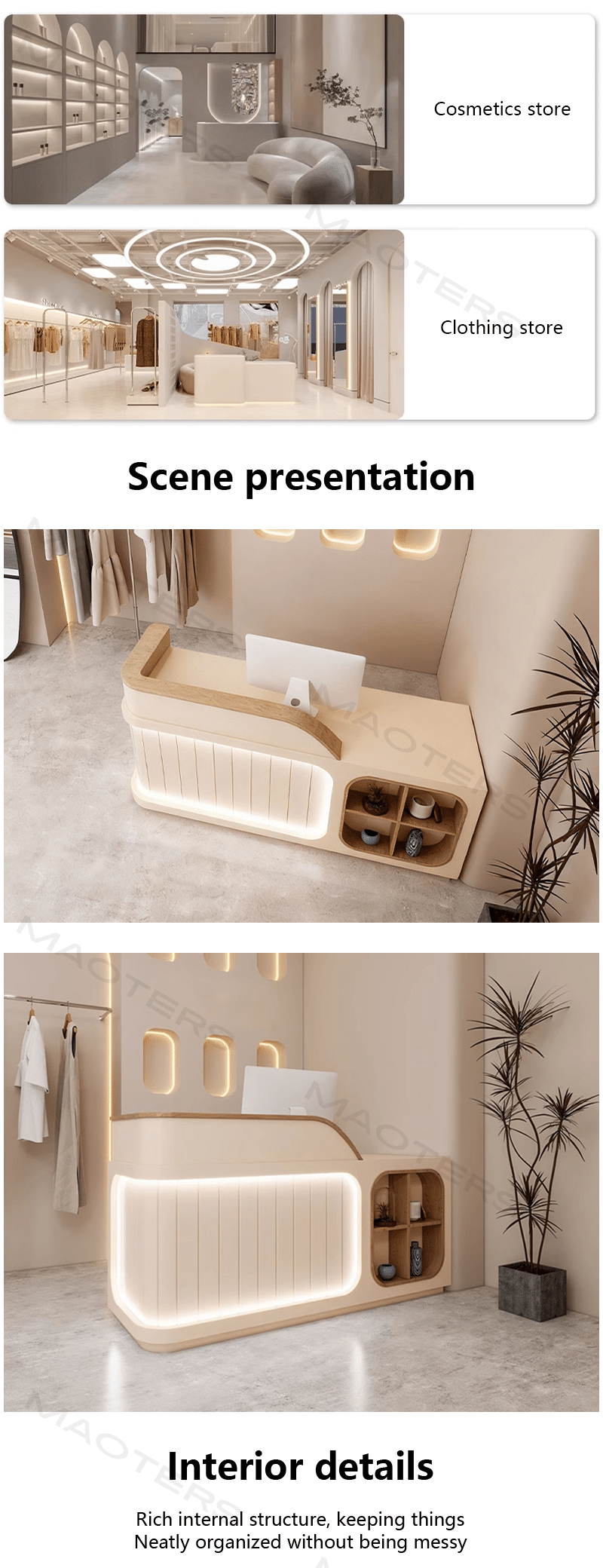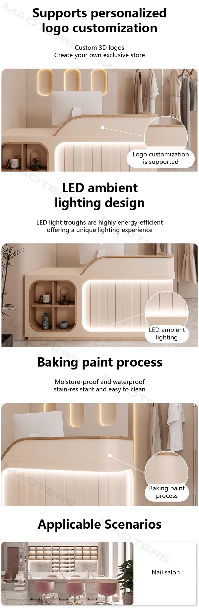 The Customizable Corner Reception Desk With Light combines modern design and functionality to create a sophisticated reception area. Its corner configuration allows for optimal space utilization, making it perfect for offices, hotels, and other businesses with limited space. The built-in lighting feature enhances the desk’s aesthetic, creating a welcoming atmosphere for guests and clients. With customizable options for size, color, material, and additional features, this reception desk can be tailored to match your business’s unique style. Crafted from high-quality materials, it ensures durability and ease of maintenance, providing both style and practicality for high-traffic areas.