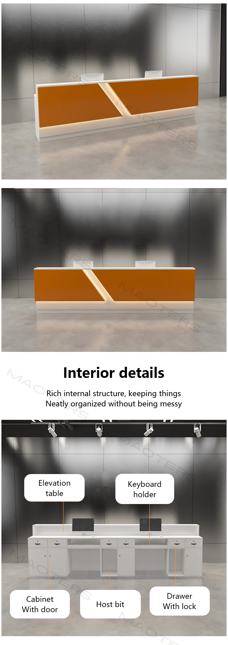 - Ample Workspace & Storage – Provides sufficient counter space for receptionist tasks and organized storage for documents, schedules, and materials.