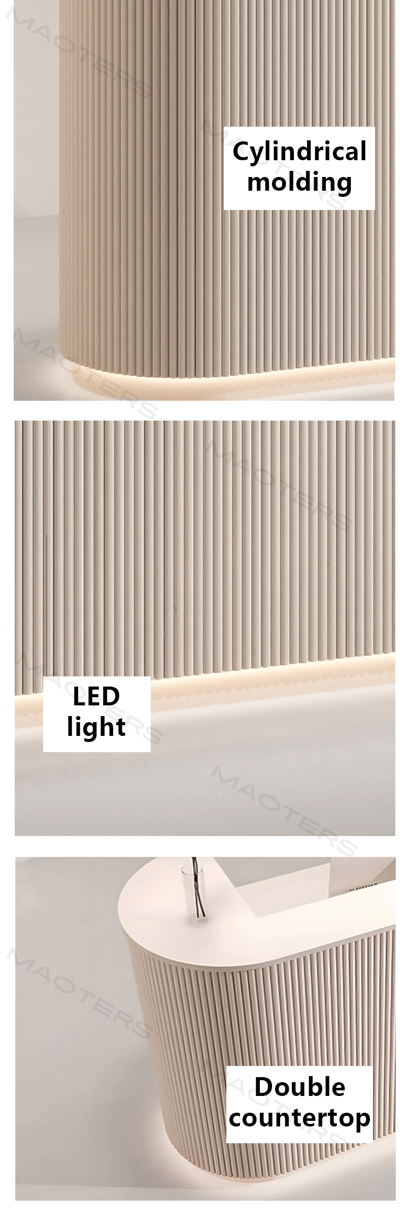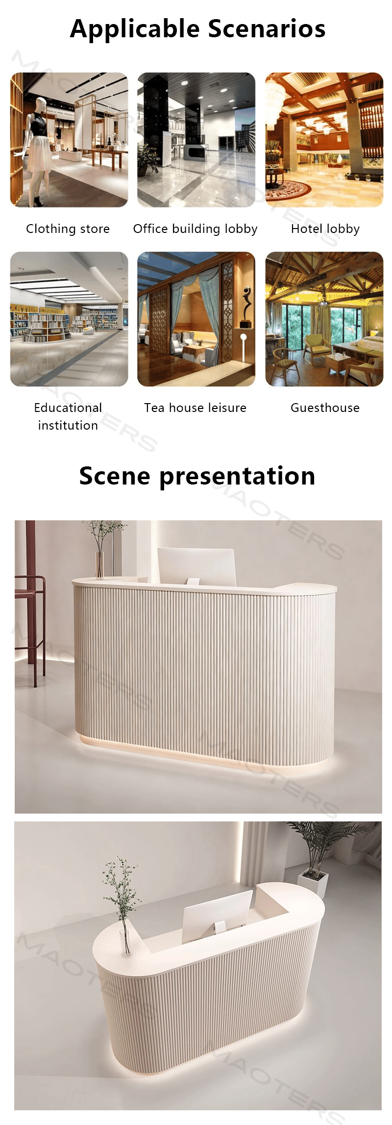 The reception desk features a simple and streamlined design with a smooth and delicate surface,giving it an excellent feel.Its overall appearance is elegant yet sophisticated,and I am very satisfied.Definitely worthy of a positive review.