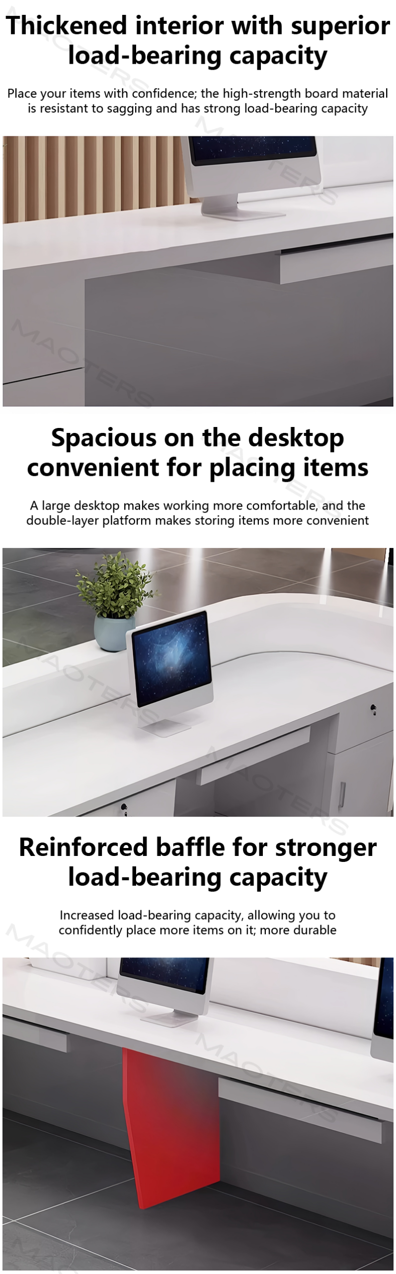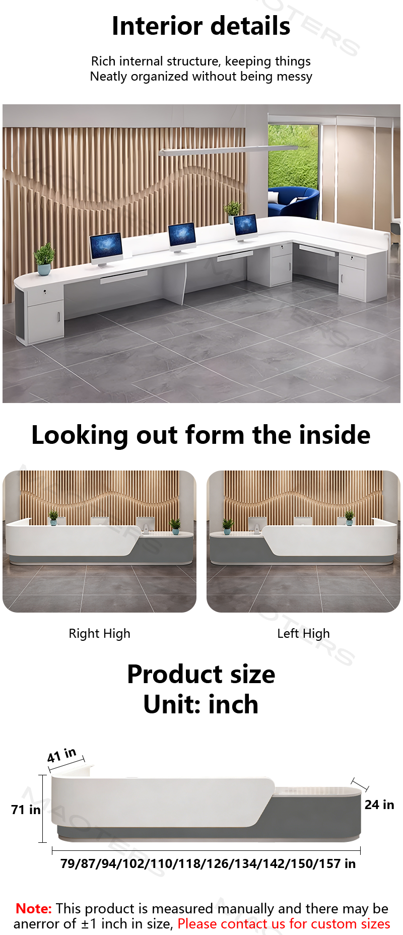 The reception desk is truly impressive.The workmanship is top-notch,and the quality is excellent.The appearance is exquisite and perfectly matches the description.There's absolutely no odor,which is a definite plus,and the size is just right.Best of all,it's more affordable than similar products in physical stores,offering better value for money.