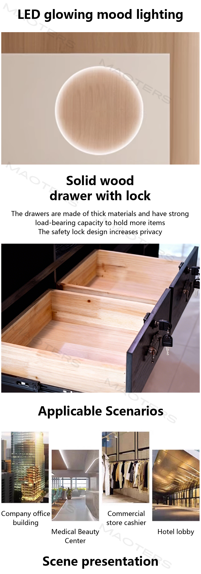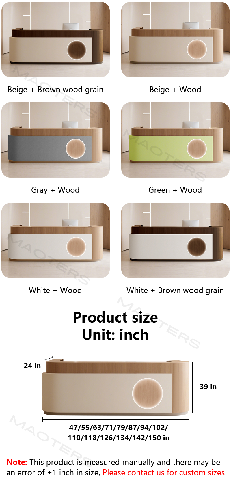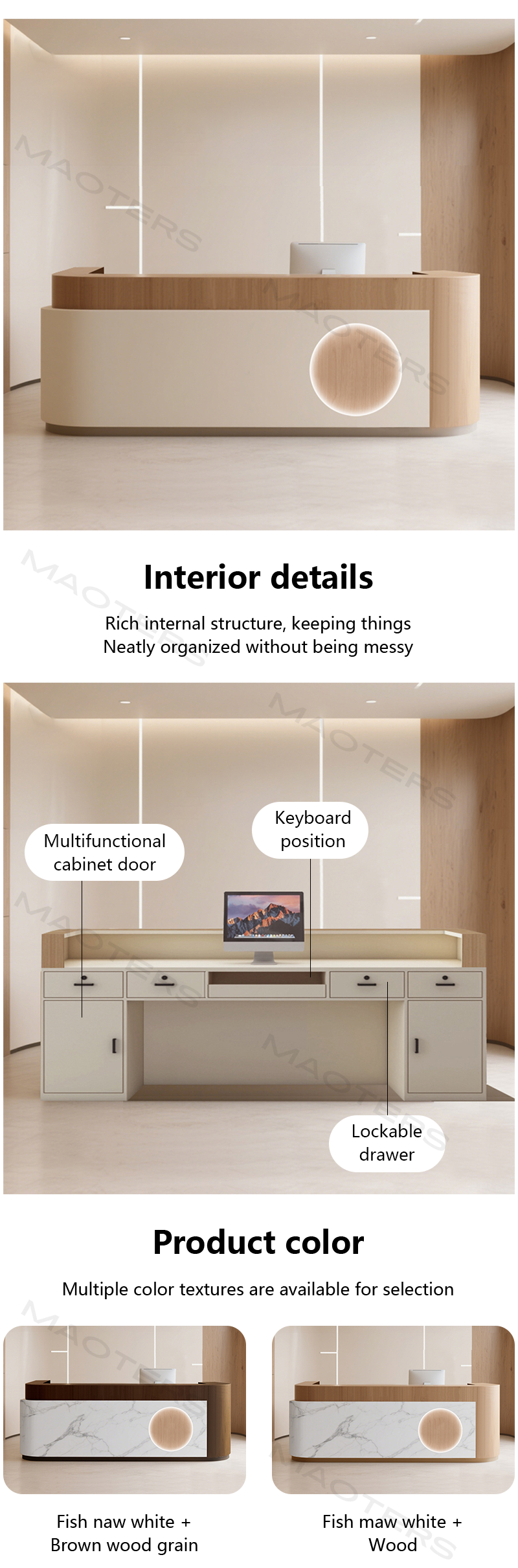 Versatile Adaptability: Whether a hair salon needs hidden storage, a dance studio requires an elegant check-in desk, or a boutique needs to showcase its products, this reception desk offers the ideal solution. Customizable options include built-in drawers, concealed cable management, side cabinets, and customizable dimensions, ensuring the perfect balance of form and function.