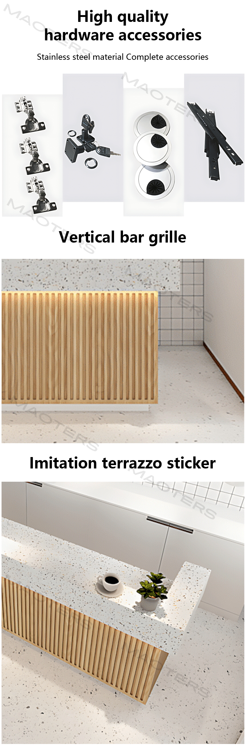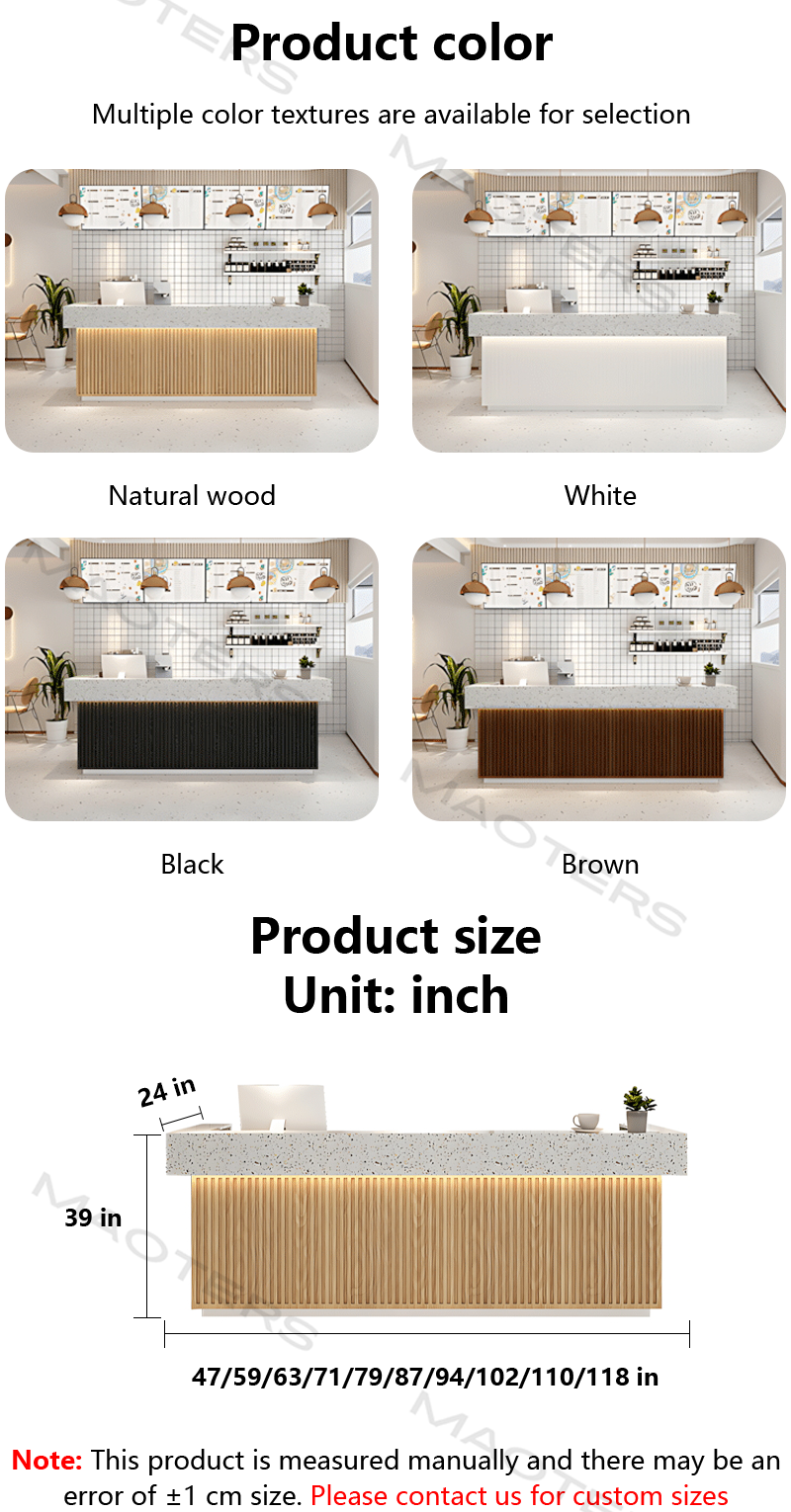 The Maoters Simple Modern Reception Desk is designed to blend seamlessly with any professional environment, offering both style and practicality. Its sleek, minimalist design makes it a perfect choice for offices, hotels, or retail spaces. Crafted with high-quality materials, this reception desk ensures durability and easy maintenance, while its spacious work surface provides ample room for reception tasks and customer interactions. Whether you’re setting up a corporate office or a boutique, this modern desk elevates your space, offering a clean and inviting look. Customizable in size, color, and finish, it can be tailored to meet your specific needs.
