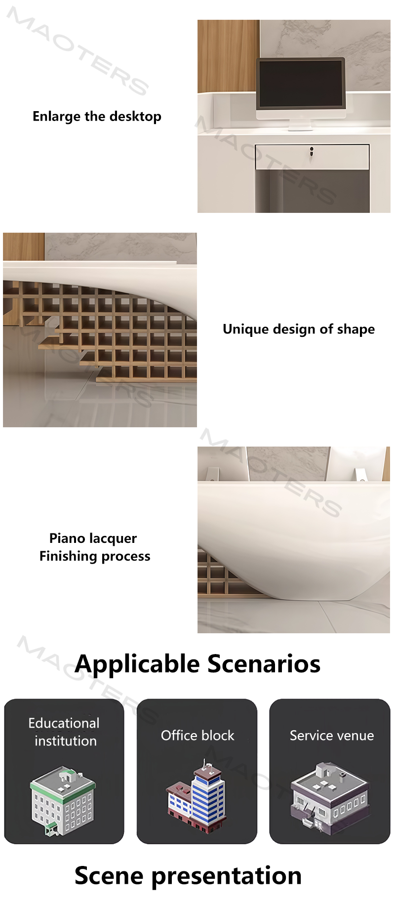 The design balances aesthetics with high efficiency and practicality. Recessed cable management holes keep the countertop tidy, while the spacious surface and ergonomic design provide a comfortable operating experience for reception staff. A sturdy base ensures overall stability.