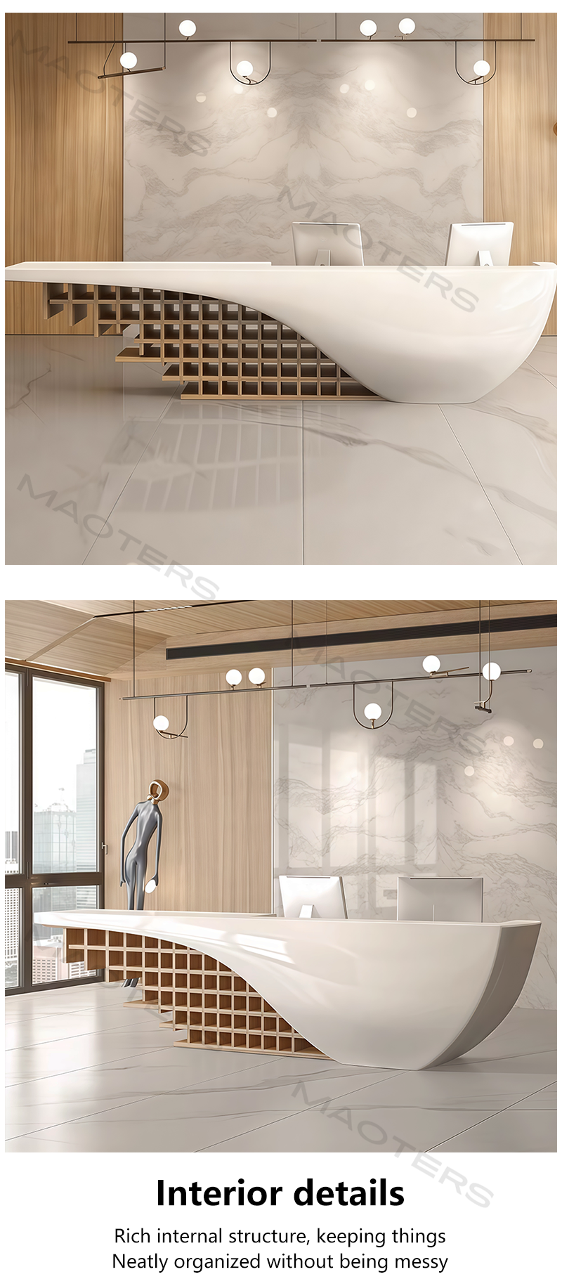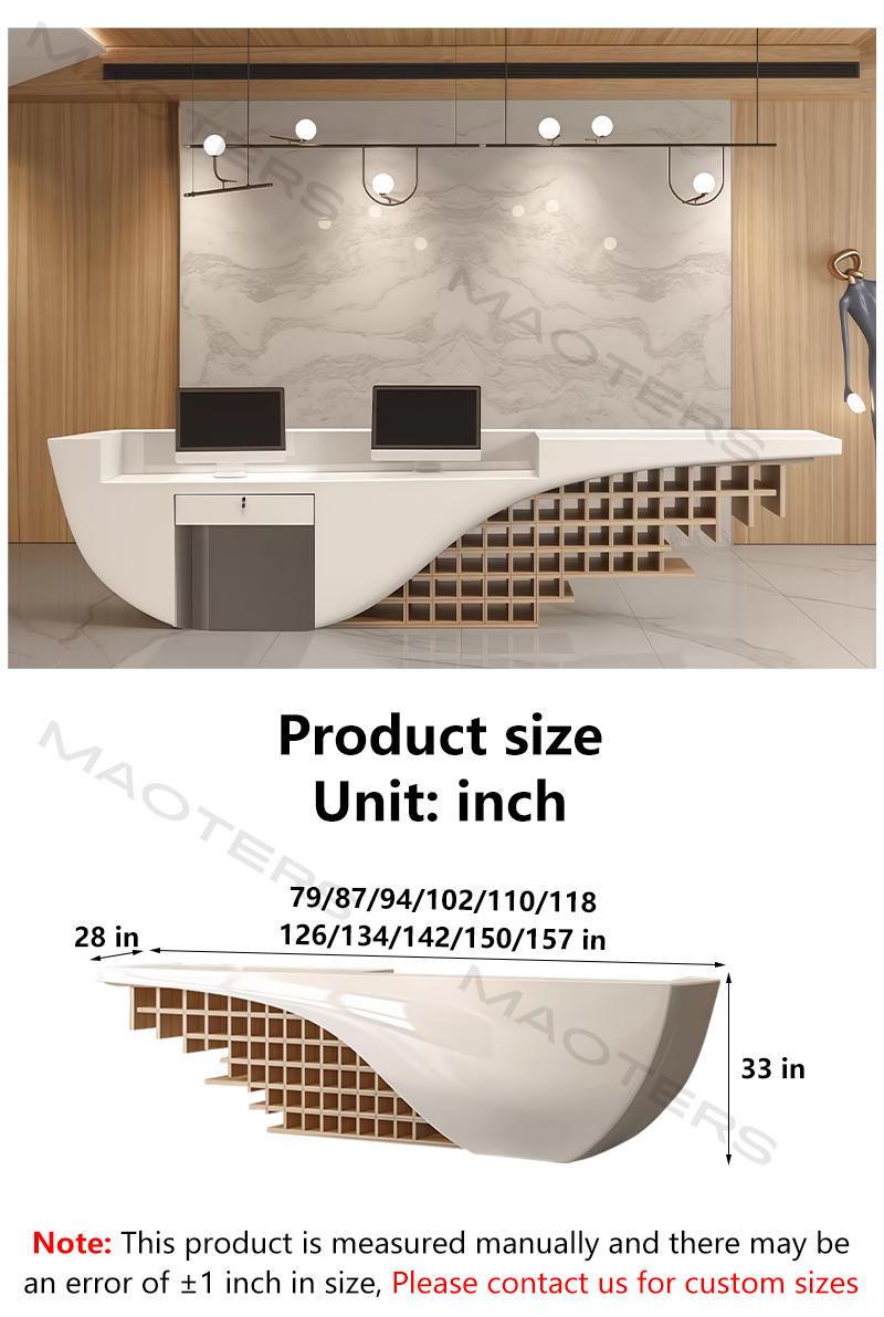 This modern, creatively designed, lacquered reception desk breaks away from the traditional square framework of office furniture, injecting a sculptural feel into the business space with its flowing curves and bold geometric cuts. It’s not just a functional reception desk, but a visual declaration showcasing a company’s cutting-edge creativity and unique taste.