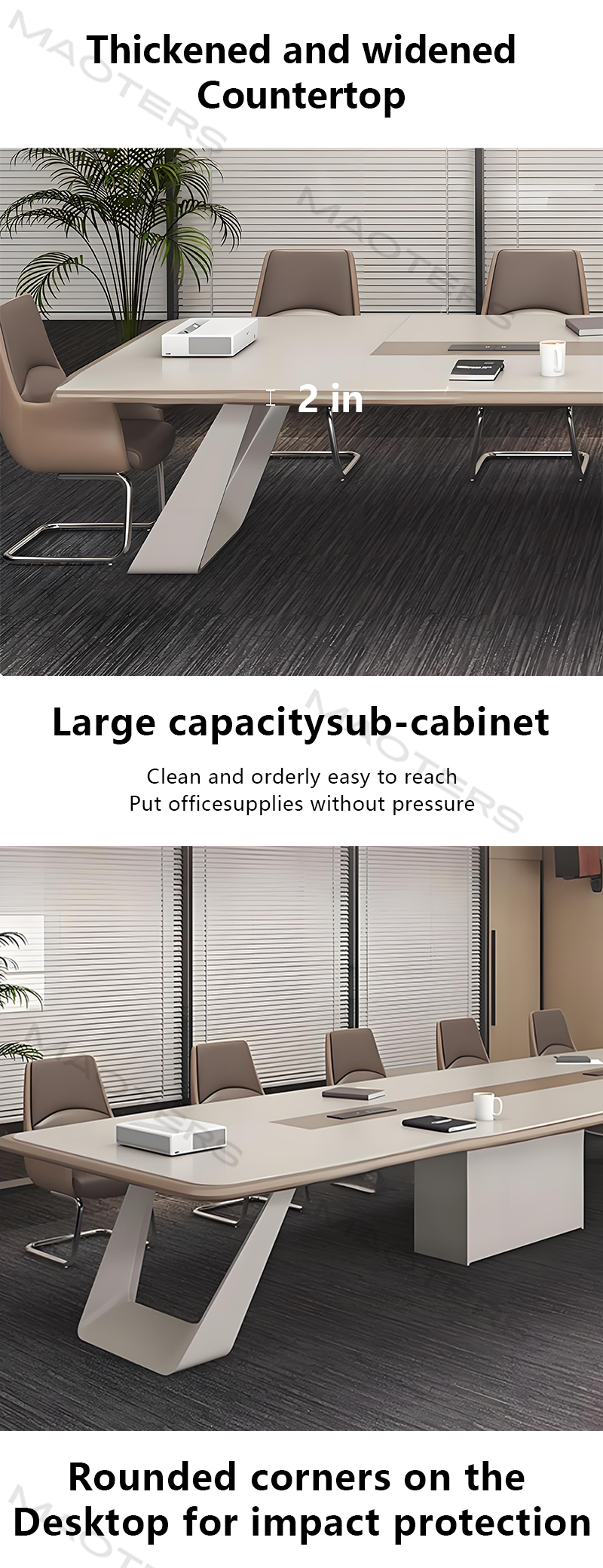 Each conference table undergoes multiple layers of fine spraying and high-temperature curing, resulting in a uniform and smooth lacquer surface with excellent wear resistance, scratch resistance, and corrosion resistance, maintaining its shine even after long-term use. The rigorous structural design and high-strength support system ensure the table’s stability and sturdiness, providing a reliable and worry-free experience for important meetings.