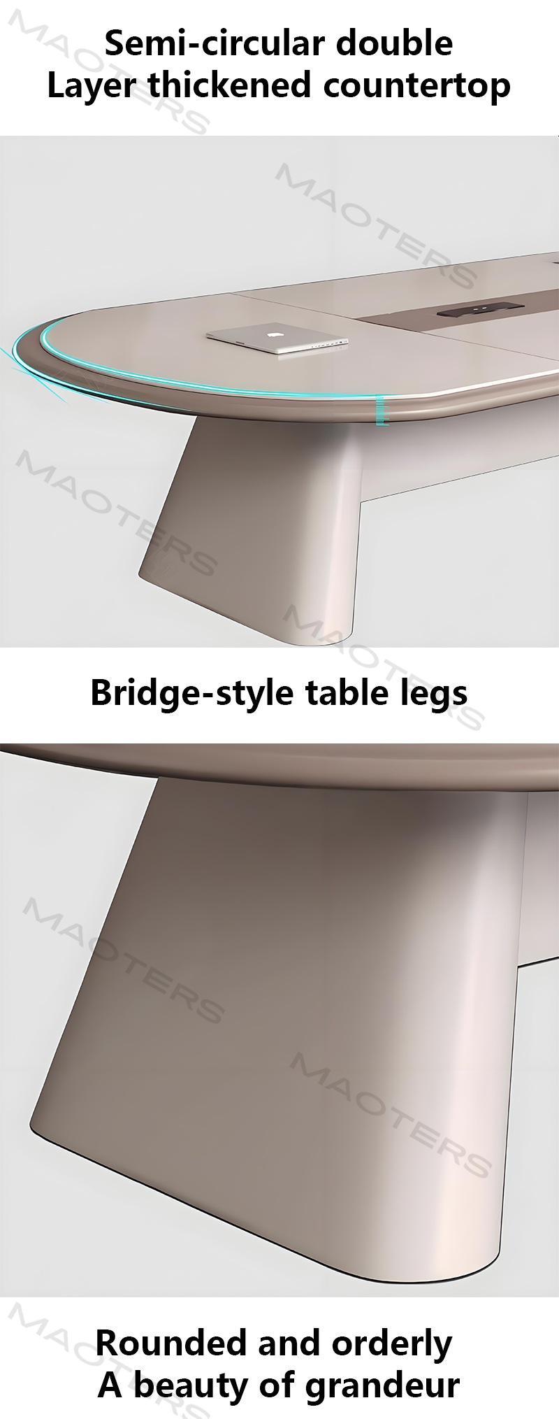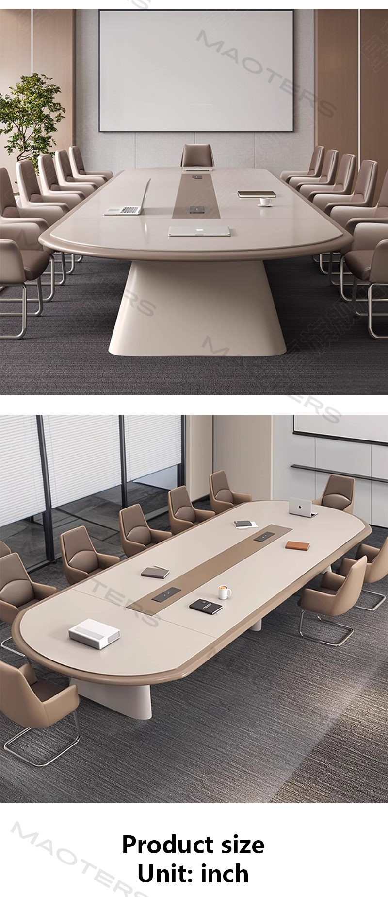 This modern minimalist long conference table, centered on the design philosophy of “less is more,” perfectly blends pure lines, practical functionality, and spatial awareness. The extra-long tabletop, crafted from select environmentally friendly boards and featuring a natural wood grain finish, provides a continuous and expansive meeting surface, suitable for everyday team discussions as well as meeting the diverse needs of large group meetings. The simplified design language allows attention to focus on people and topics, creating a focused and efficient communication atmosphere.