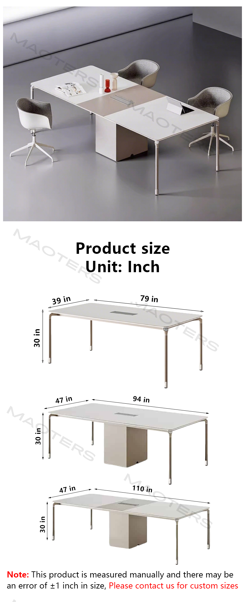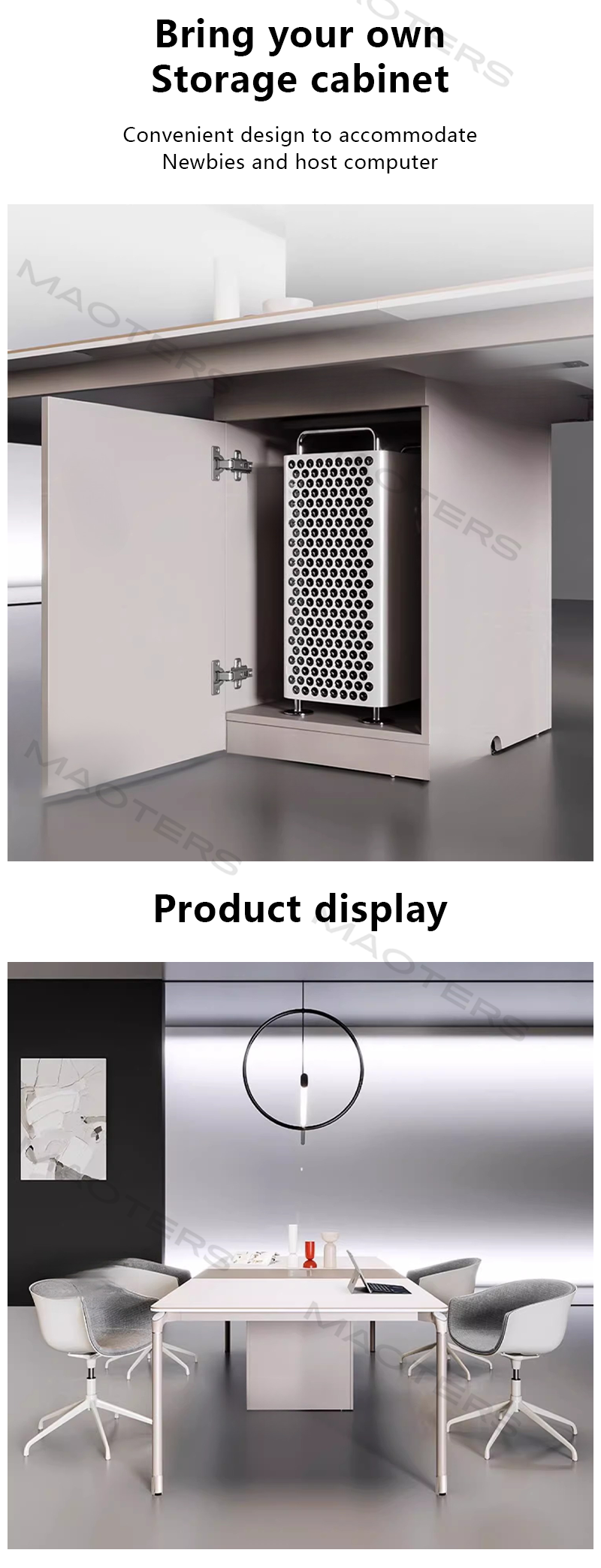 Intelligent integration, combining functionality and aesthetics. User-friendly intelligent configuration: Optional features include an embedded wireless charging module, a retractable power outlet, and a concealed cable management system, allowing seamless integration of technological devices and maintaining an exceptionally clean desktop. The spacious white surface acts as a pure canvas, highlighting the colors of display materials and providing ample space for creative collaboration.