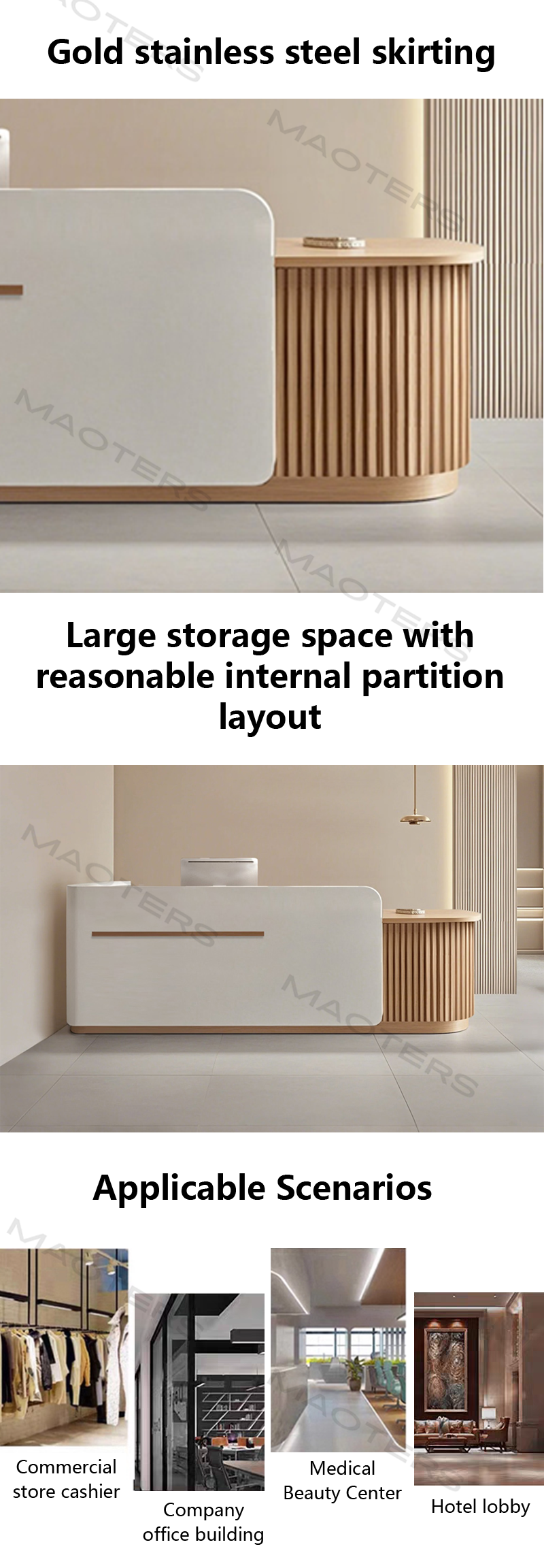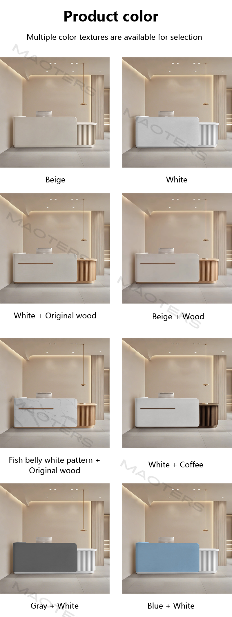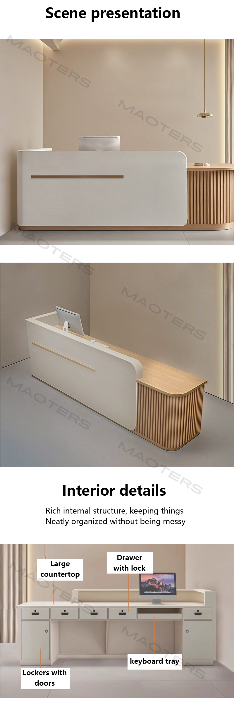 Beyond its beauty, this reception desk is intelligently functional. Discreet built-in storage, hidden compartments, and integrated cable management maintain the minimalist appeal while supporting effortless daily operations. The spacious counter offers ample room for client check-ins, consultations, and display, all while maintaining an aura of order and peace.