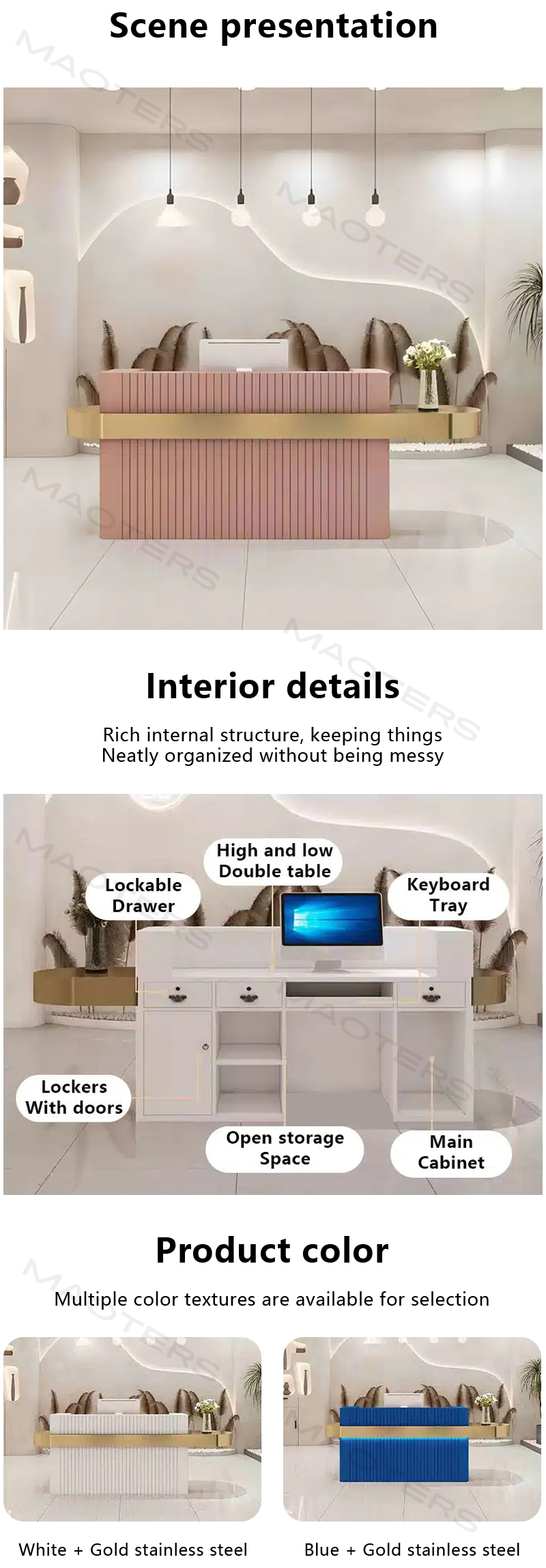 ✔ Minimalist Elegance – Clean lines, premium finishes (matte, glossy, or textured), and customizable color options to match your brand’s aesthetic. ✔ Luxury Materials – High-quality marble, wood veneer, or acrylic surfaces paired with brushed metal or matte black accents for a refined look. ✔ Space-Smart Layout – Compact yet functional design perfect for small boutiques, upscale salons, or chic spas. ✔ Built-In Storage – Discreet drawers or shelves for storing client files, POS systems, and beauty essentials. ✔ Client-Friendly Surface – Smooth, easy-to-clean countertop for a hassle-free, hygienic workspace.