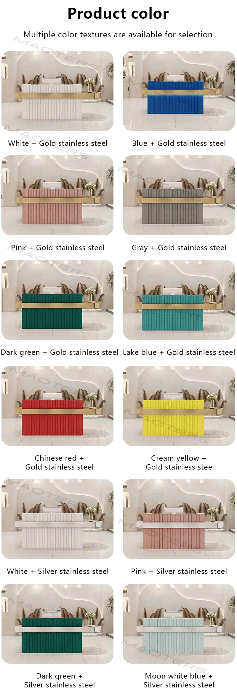 ✔ Minimalist Elegance – Clean lines, premium finishes (matte, glossy, or textured), and customizable color options to match your brand’s aesthetic. ✔ Luxury Materials – High-quality marble, wood veneer, or acrylic surfaces paired with brushed metal or matte black accents for a refined look. ✔ Space-Smart Layout – Compact yet functional design perfect for small boutiques, upscale salons, or chic spas. ✔ Built-In Storage – Discreet drawers or shelves for storing client files, POS systems, and beauty essentials. ✔ Client-Friendly Surface – Smooth, easy-to-clean countertop for a hassle-free, hygienic workspace.
