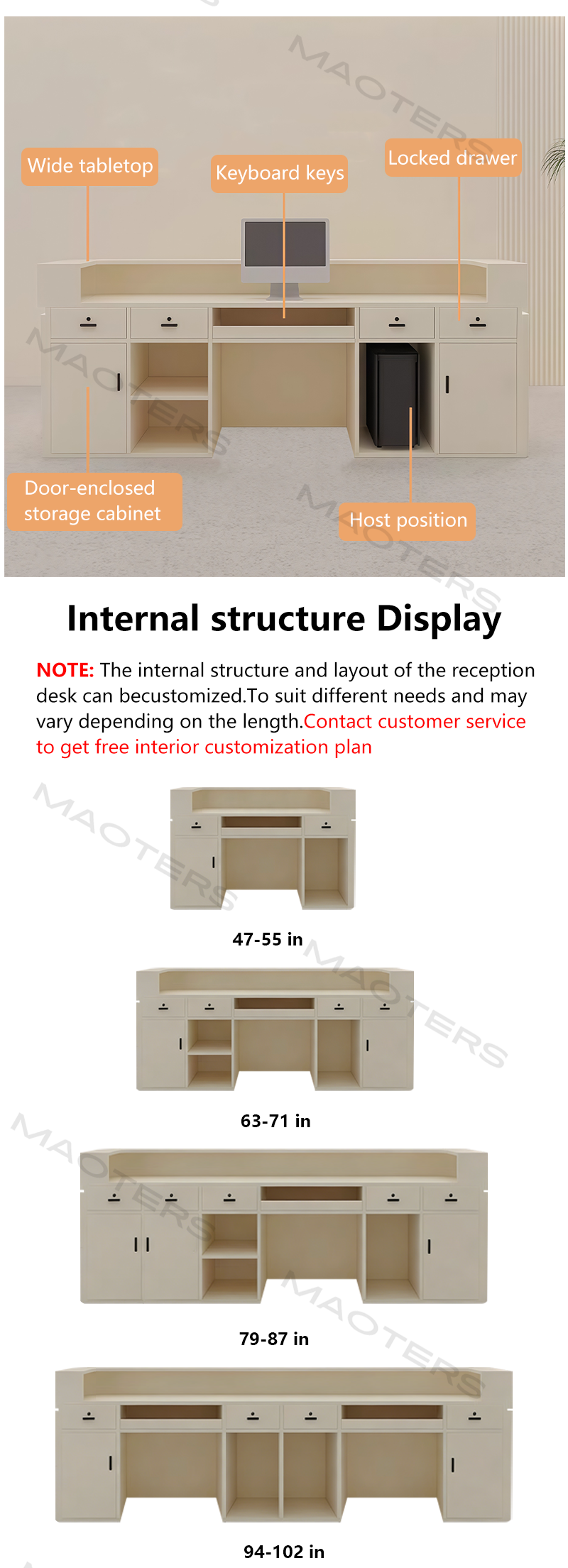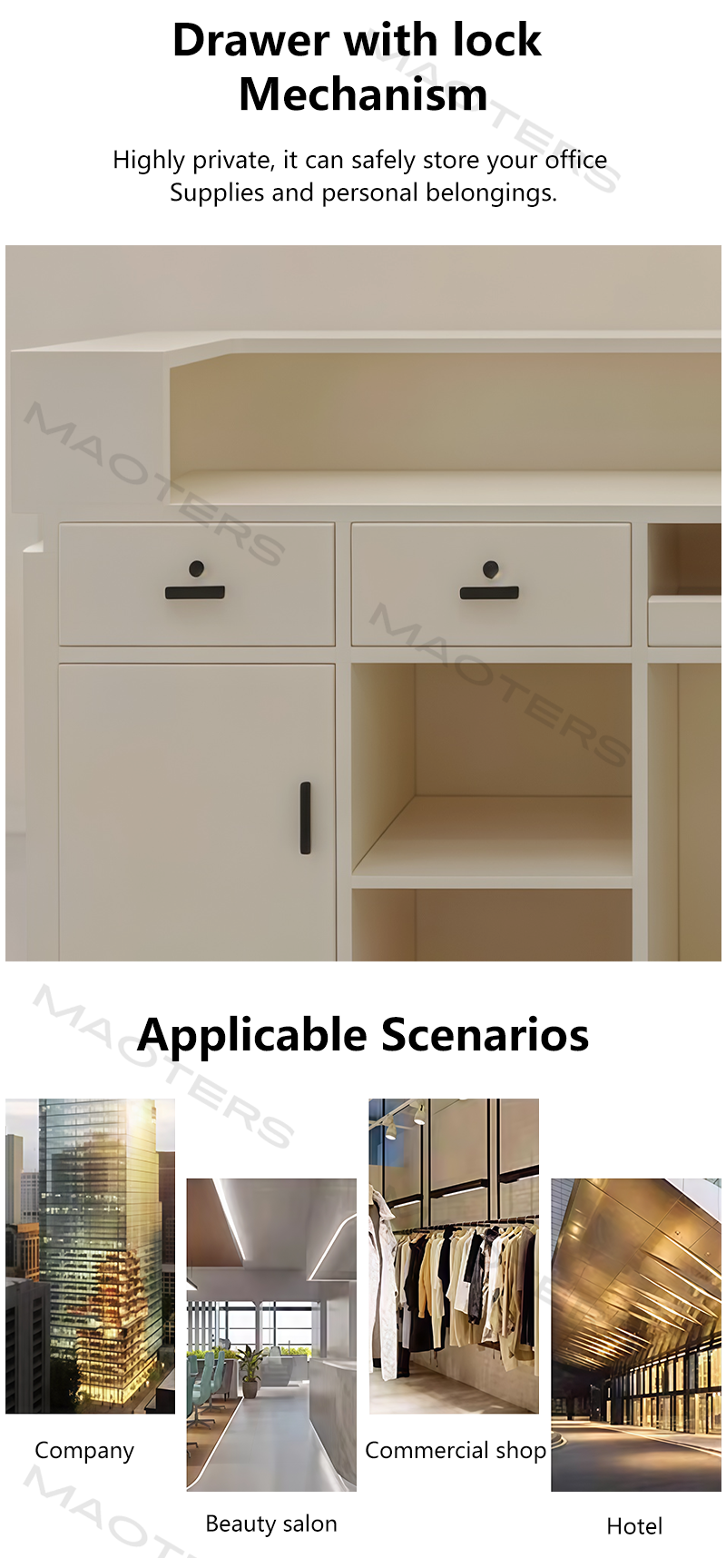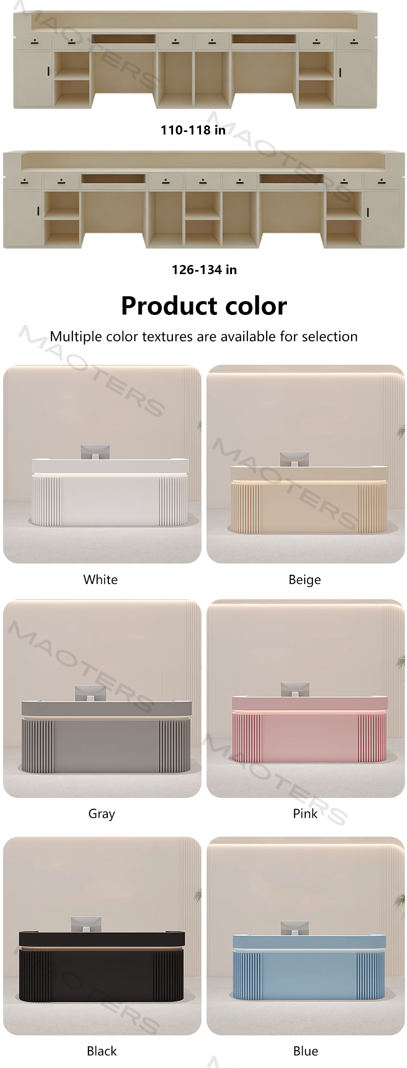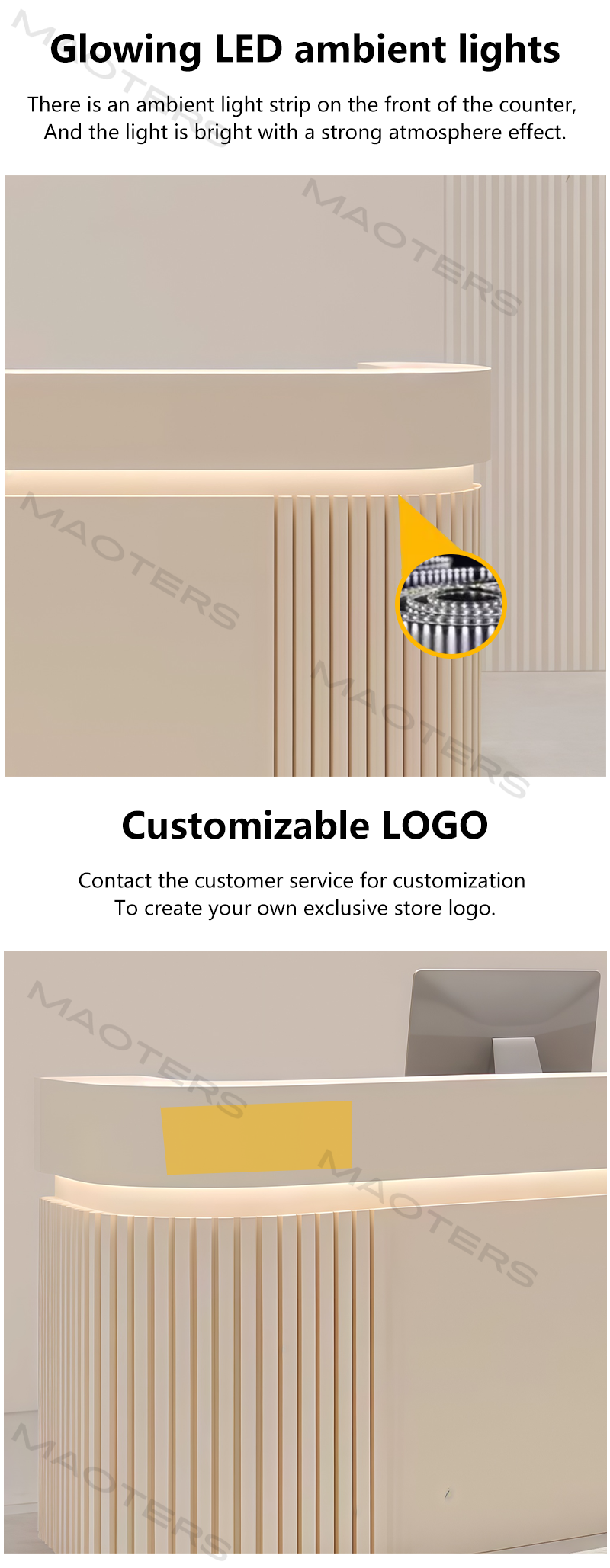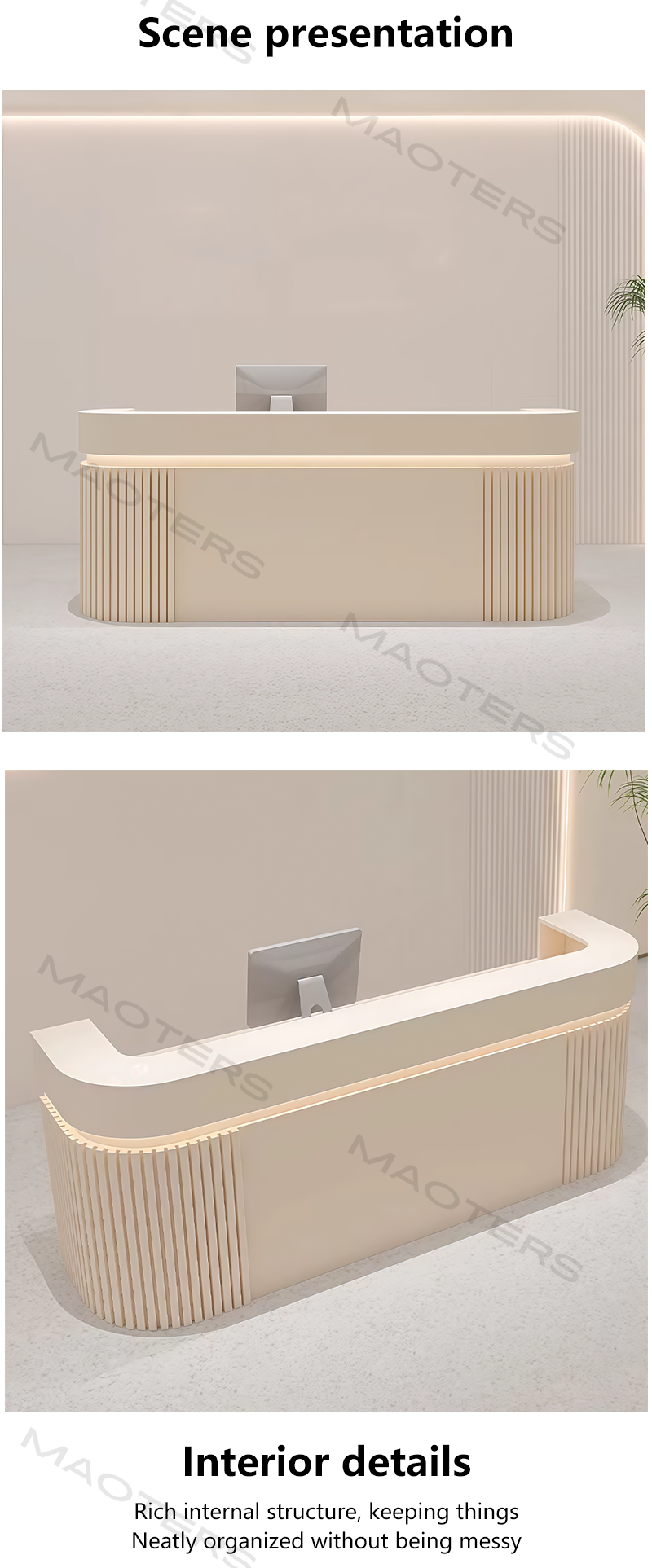 The sides feature a three-dimensional vertical stripe design, injecting rhythm and depth into the simple lines and contours. The delicate texture adds refined details to the minimalist style, creating a more visually breathable feel.An LED light strip is embedded in the upper part of the front desk, providing a warm, soft, and evenly distributed light. This not only enhances the luxurious feel but also creates a warm and welcoming atmosphere, allowing visitors to feel comfortable and respected from the moment they arrive.Featuring a soft, off-white base color and a delicate, matte surface, this design complements various interior styles, including modern, Wabi-Sabi, and light luxury. It serves as a perfect finishing touch for high-end offices, boutique hotels, and aesthetic salons alike.Constructed from high-density, wear-resistant materials, the surface is scratch-resistant and stain-resistant, preventing marks from everyday use and maintaining a like-new appearance for a long time.