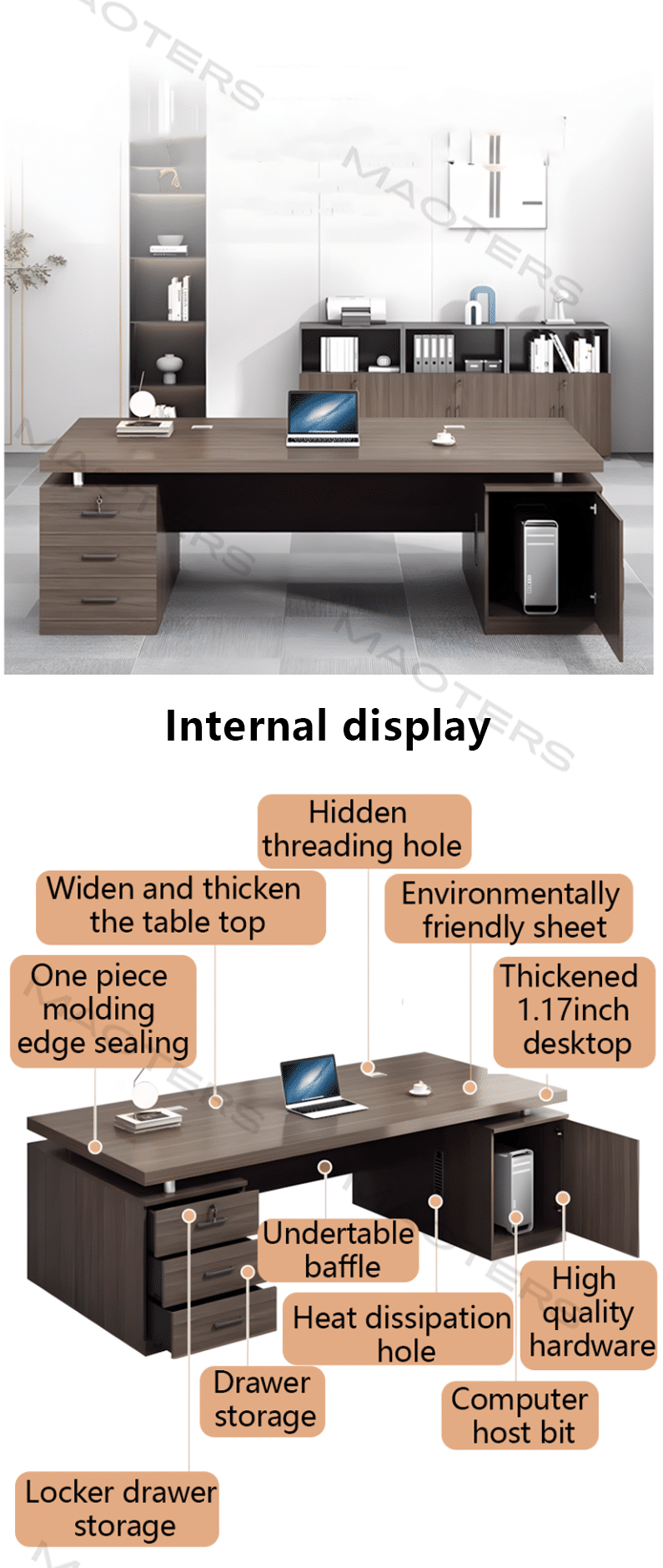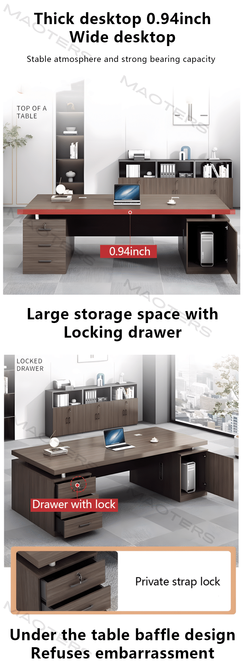 Upgrade your office with the Maoters Executive Computer Desk, a sleek and functional workspace designed for productivity and organization. Featuring dual storage cabinets, this desk offers ample space to keep files, supplies, and documents neatly tucked away while maintaining a professional aesthetic.