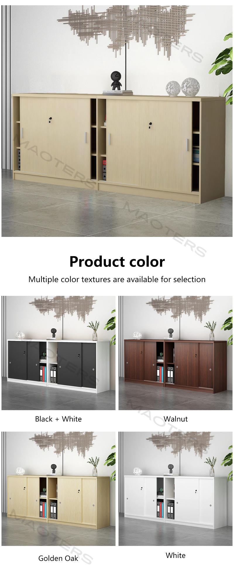 The interior design fully utilizes the width and depth of the low-profile structure, featuring multiple spacious drawers or adjustable shelves to perfectly accommodate standard file boxes, A4/A3 folders, books, and various office supplies.