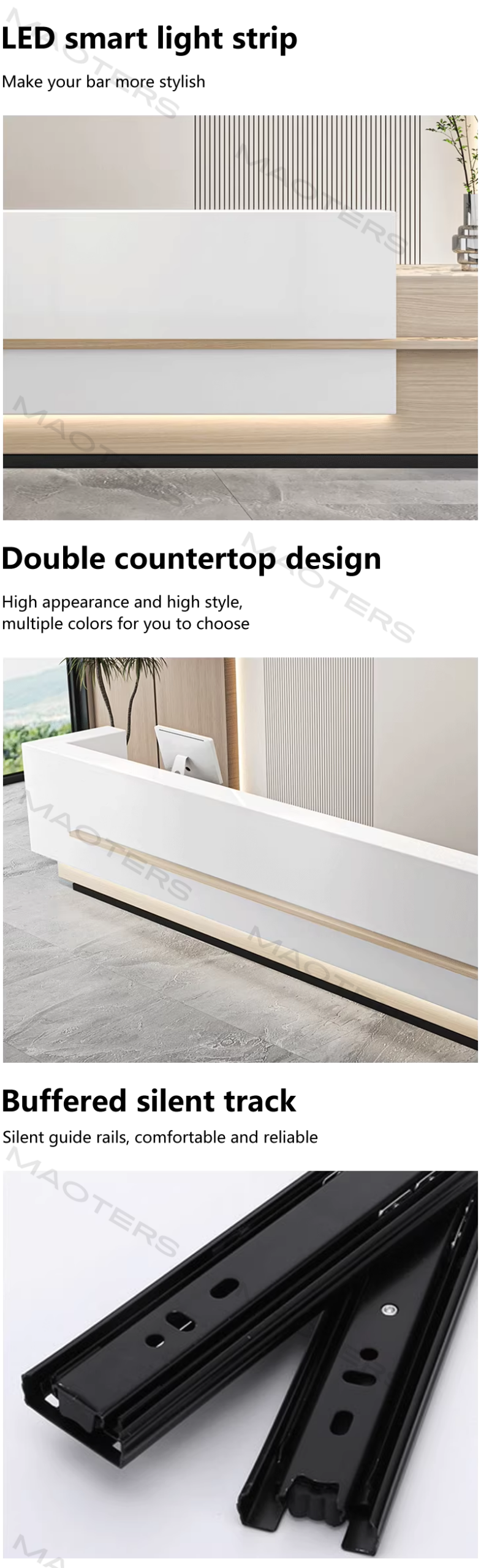 I am very satisfied with this purchase.The reception desk is not only beautiful but also stylish and attractive.The customer service resolved many of my questions,for which I am very grateful.The seller was very helpful throughout the entire process.The shipping speed was also very fast.I will definitely shop at this store again in the future.