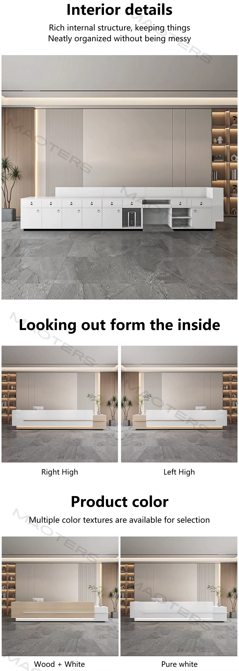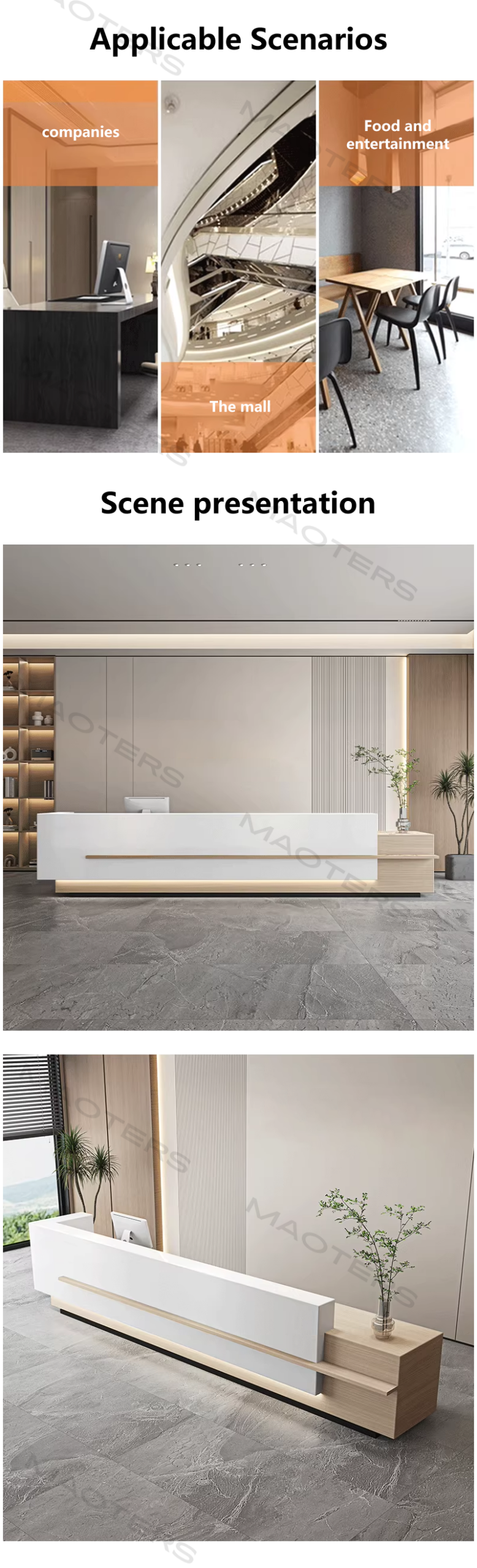 - Premium Design and Brand Elegance: We offer a variety of design styles, from modern minimalist to classic luxury, utilizing premium materials such as carefully selected natural woods, luxurious stone, high-strength glass, and metal. Each reception desk can be customized to ensure its lines, colors, and materials harmonize with your brand identity and interior décor, creating a unique and prestigious look.