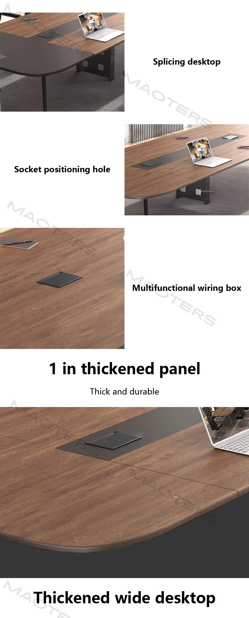 Robust Structure and Superior Craftsmanship: Utilizing high-strength composite substrate and solid wood edging, the tabletop is thick and robust, with multiple impact-resistant edges. Heavy-duty steel legs or a modular base provide exceptional stability, symbolizing the stability and reliability of the meeting.