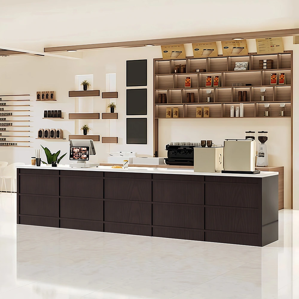 Vintage Industrial Design: Featuring a combination of reclaimed wood and metal accents, this counter brings a stylish, rustic look that complements modern coffee shop or bar aesthetics.
