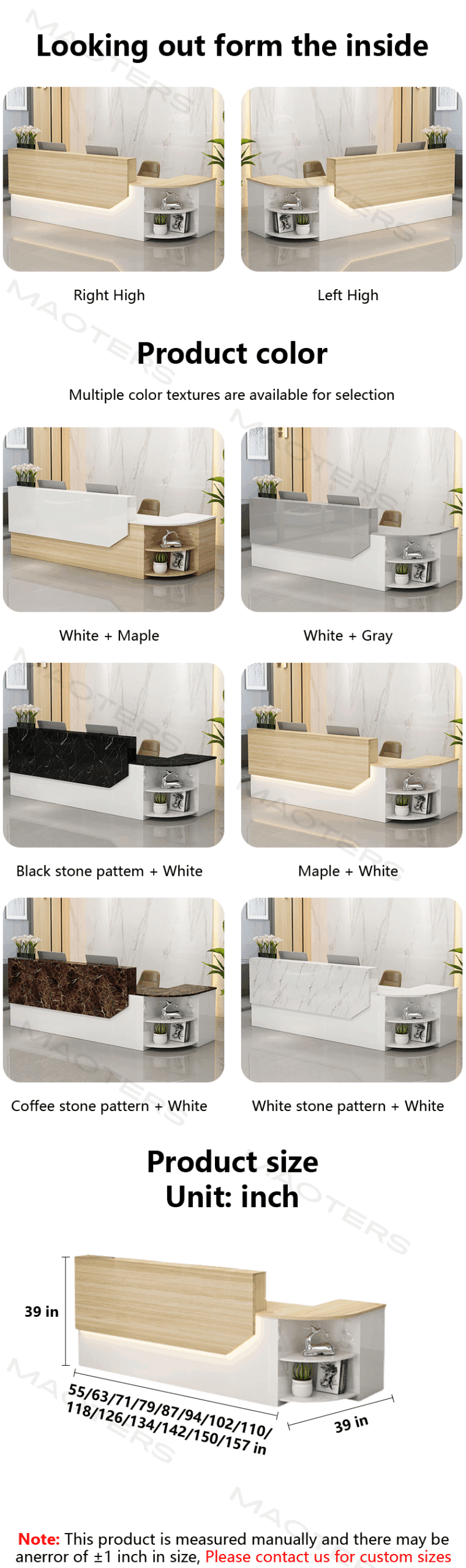 The dimensions are spot-on, the craftsmanship is excellent, and it's user-friendly. The price is reasonable, but the appearance and feel are even more luxurious than I had imagined. I consider it a very imposing reception desk. It's truly enhanced the atmosphere of my office. For such quality at this price, it's an absolute steal. I'd definitely purchase again.