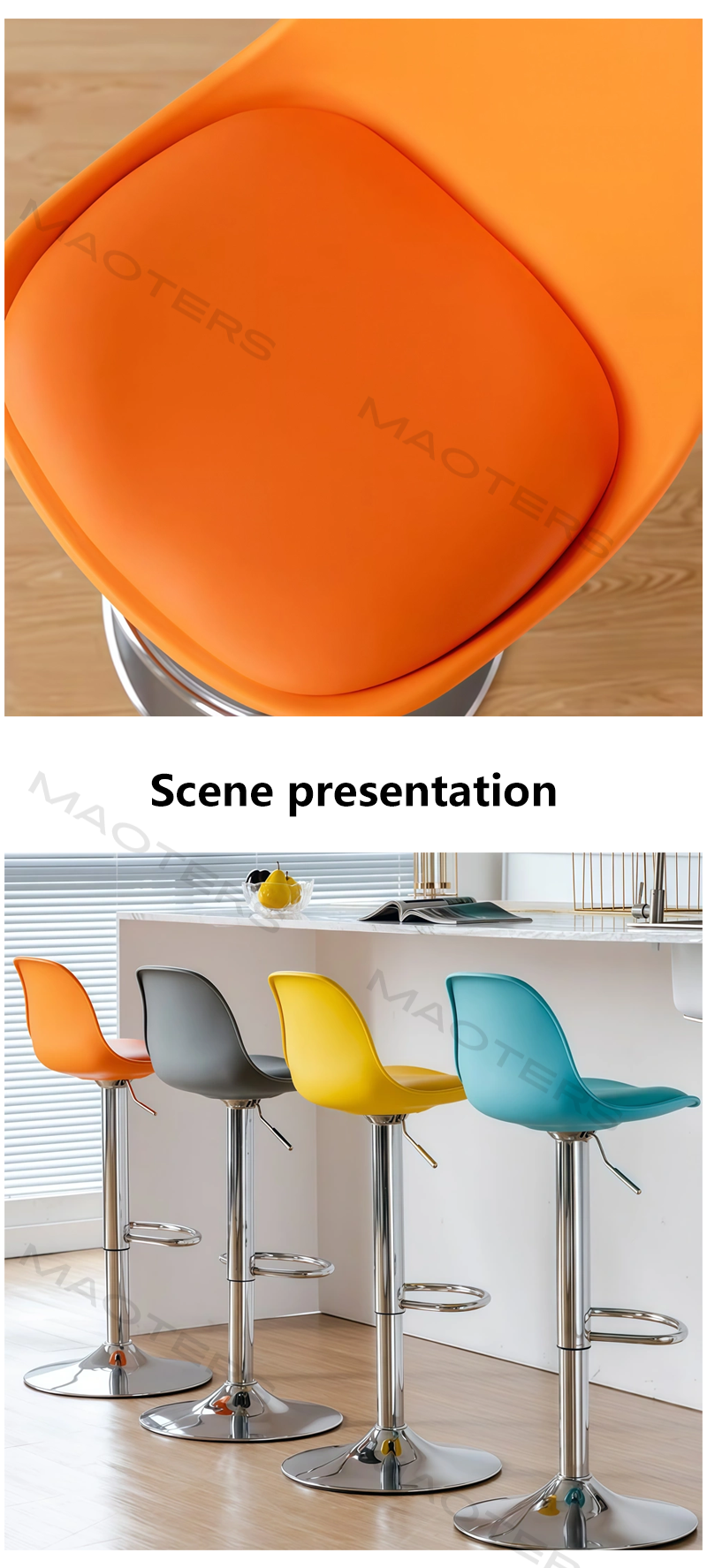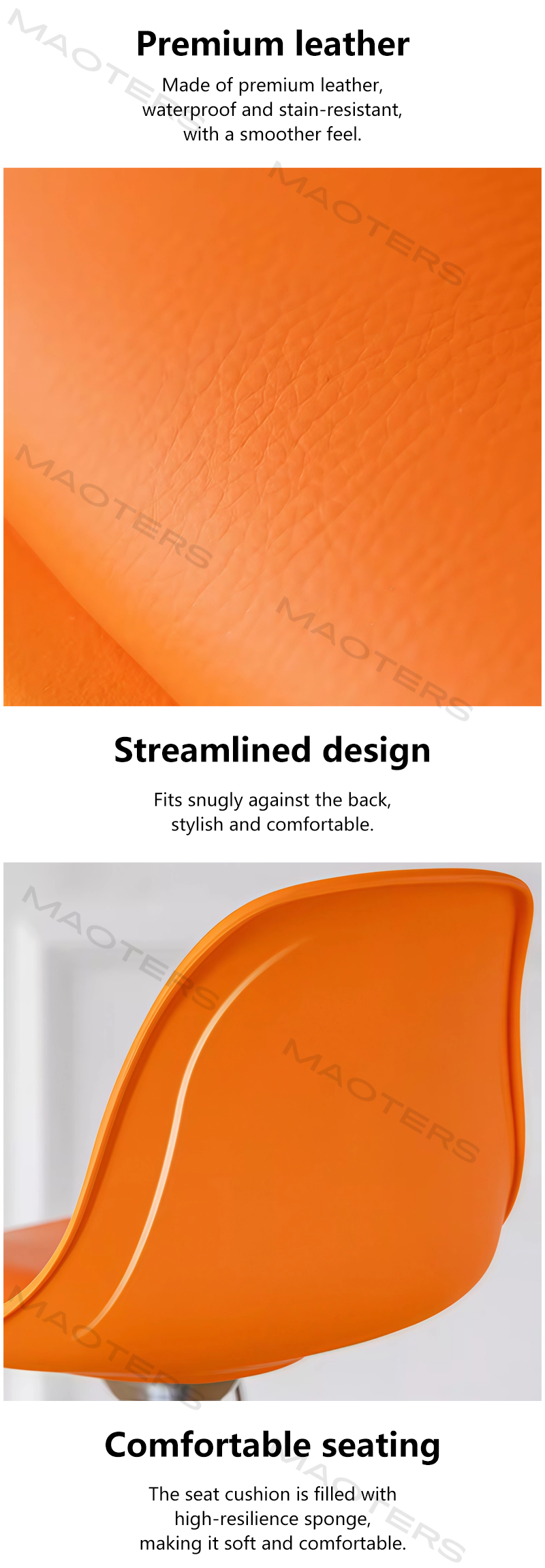 Simple and Comfortable Seating: The round or saddle-shaped seat design, filled with high-density foam and covered with easy-to-clean fabric or faux leather, provides just the right amount of comfort.