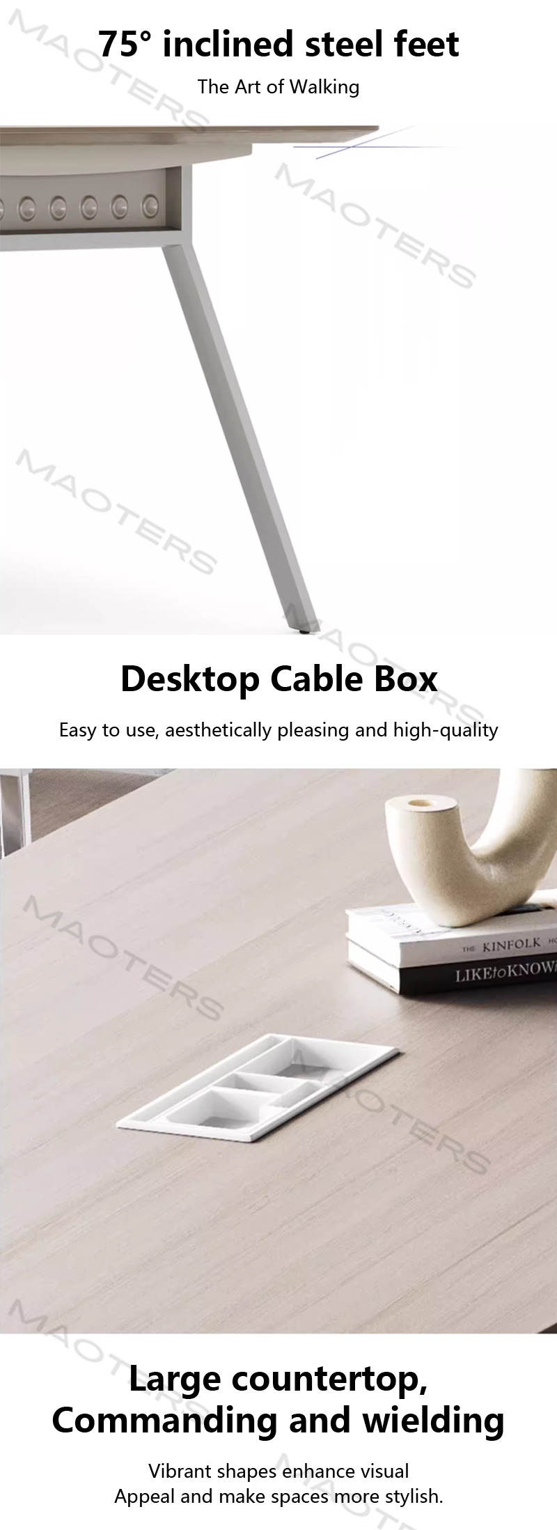 Intelligent and discreet technological integration: It elegantly internalizes the technological needs of modern offices. Optional features include an integrated wireless charging panel, a concealed cable management system, and pre-installed multimedia interfaces, ensuring seamless connectivity and a perpetually tidy desktop.