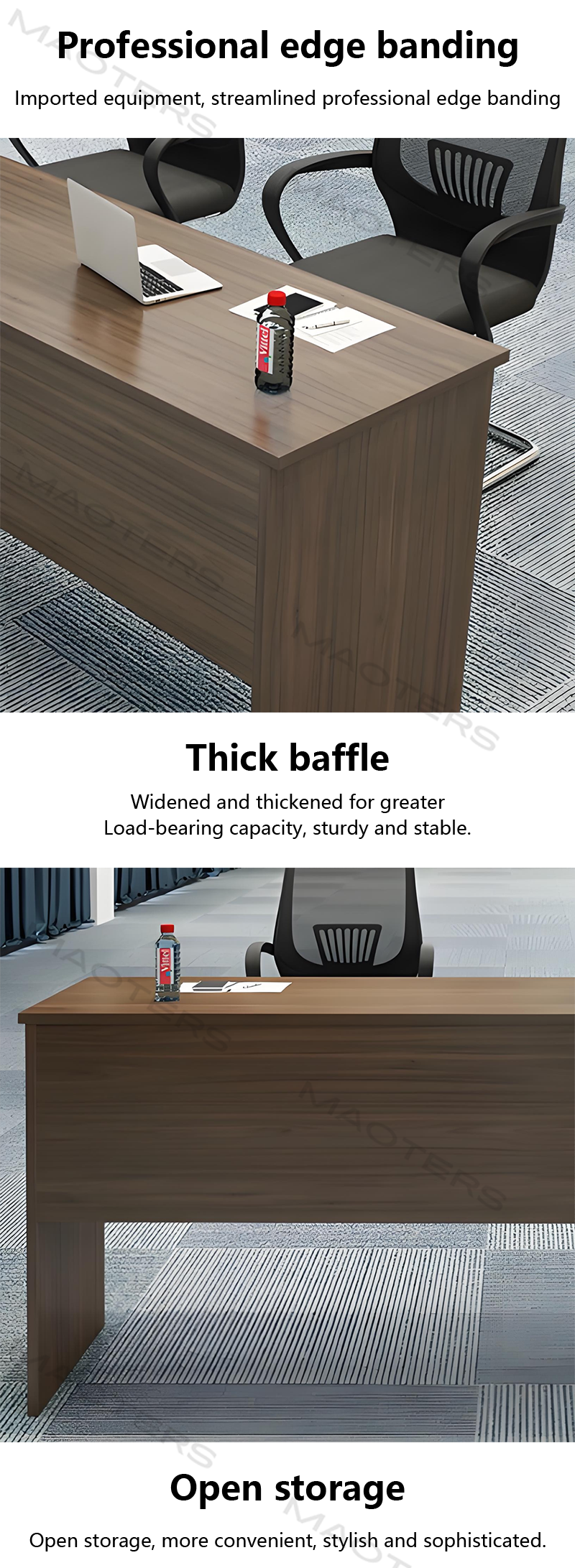Integrated Cable Management: Pre-installed cable holes on the desktop, with optional concealed cable management channels, easily solving the problem of centralized power supplies and messy data cables for laptops, projectors, and other devices.