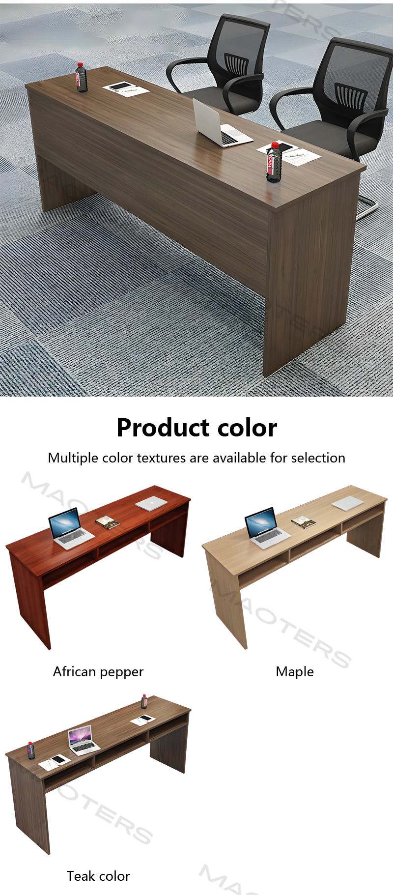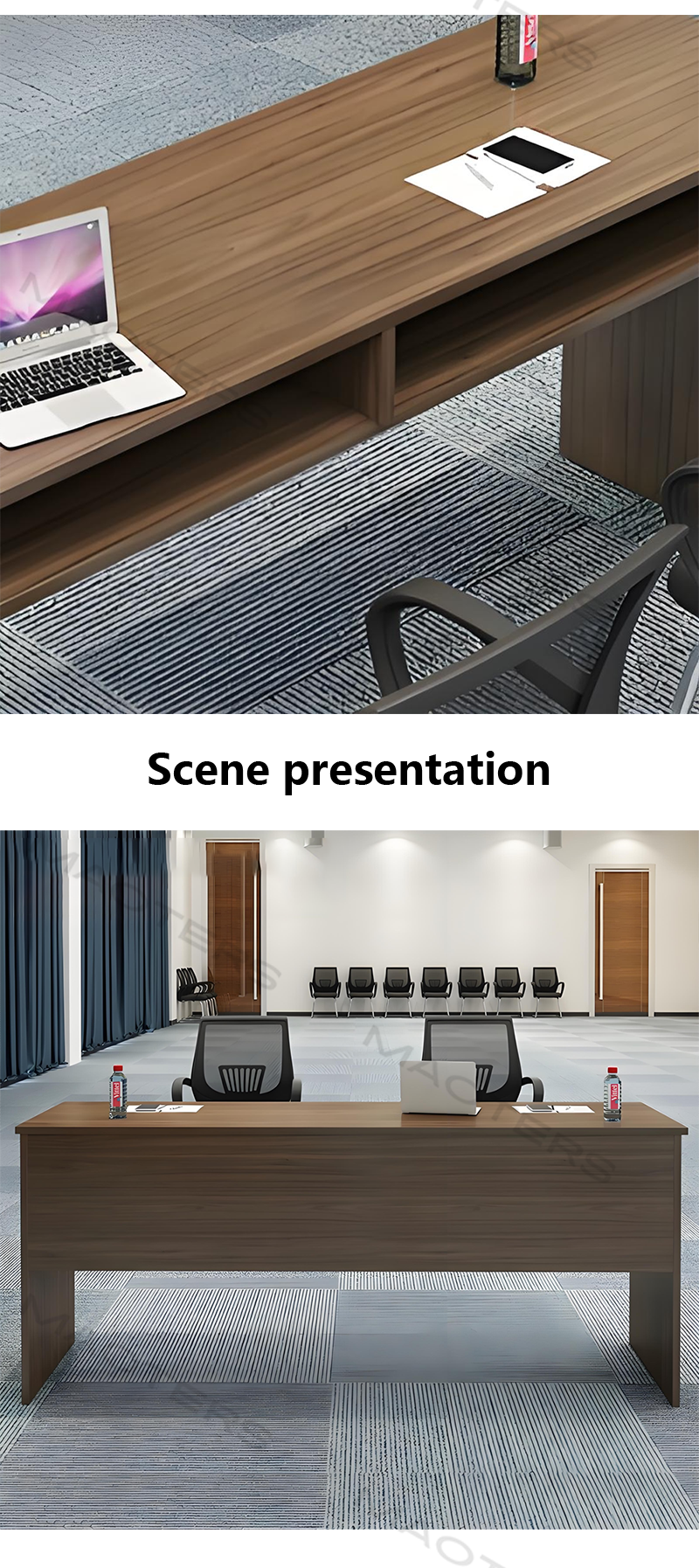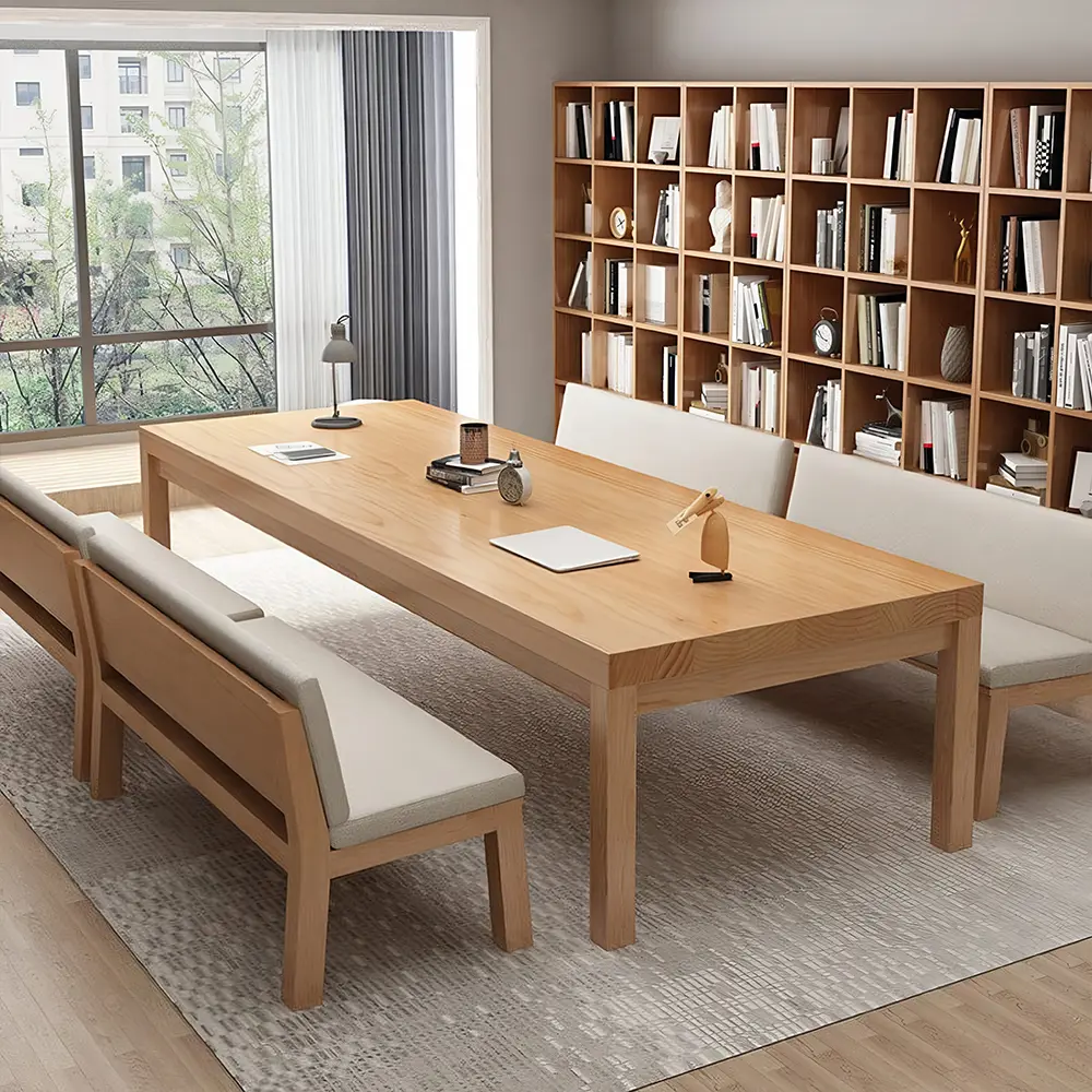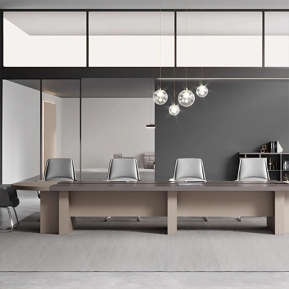 Simple and Professional Design: Clean, crisp lines and sophisticated color palettes (such as dark gray and light wood grain) create a focused and undisturbed learning and meeting environment. The slim tabletop and sturdy support structure create visual balance, highlighting the sense of order in a modern office space.