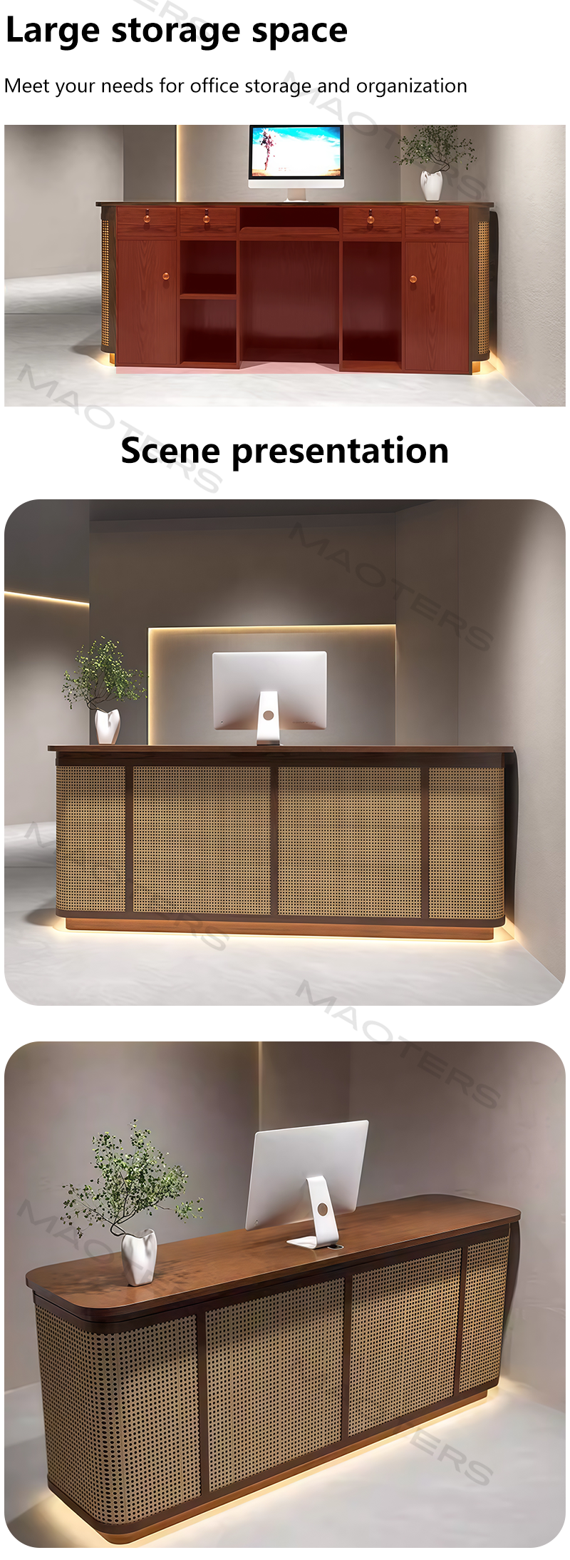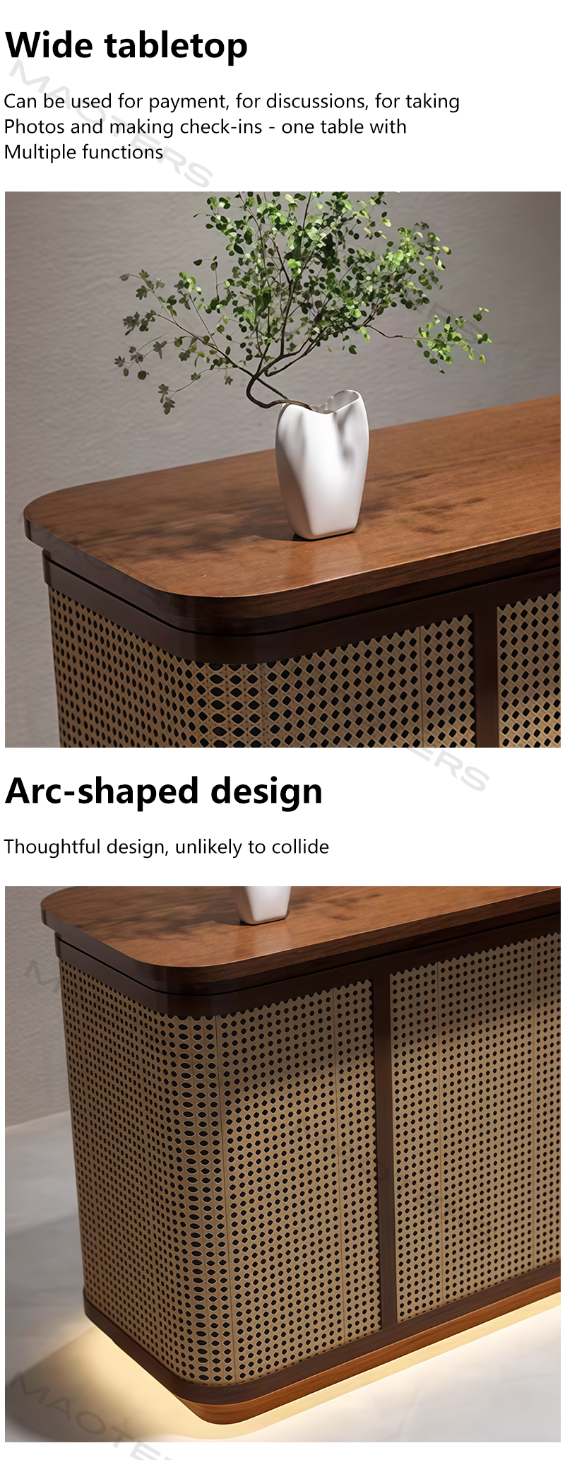 Blending the timeless elegance of traditional Chinese aesthetics with the natural warmth of rattan craftsmanship, this Chinese-style rattan bar counter reception desk is a perfect fusion of functionality and cultural charm. Ideal for tea houses, Chinese-style restaurants, boutique hotels, or cultural-themed commercial spaces, it brings a touch of serene, retro elegance to any reception area.Rooted in traditional Chinese design philosophy of “harmony between nature and man”, this reception desk abandons overly ornate decorations, adopting a simple and elegant silhouette that echoes the grace of classical Chinese architecture. The soft, natural texture of rattan complements the calm, restrained color scheme, creating a tranquil and inviting atmosphere that makes every guest feel relaxed and welcomed. Whether paired with wooden screens, porcelain ornaments, or ink wash paintings, it seamlessly integrates into Chinese-style decor, becoming a visual focal point of the space.
