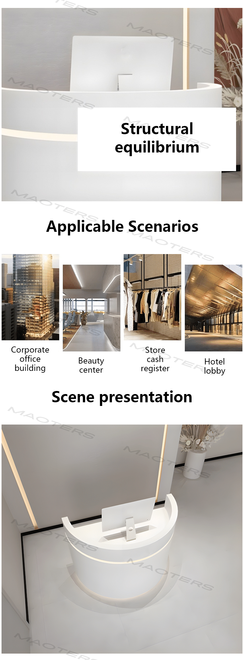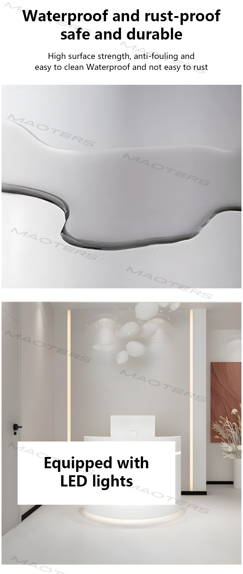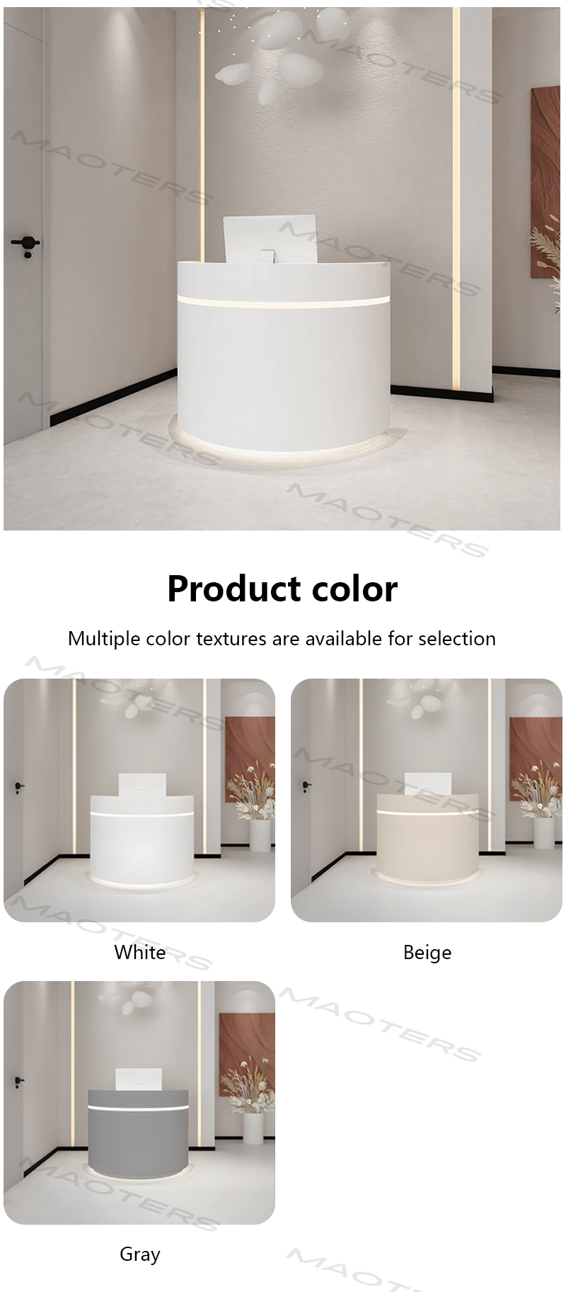 - Integrated LED Lighting – Equipped with energy-efficient LED lights that enhance the desk’s appearance, creating a vibrant and welcoming reception area.